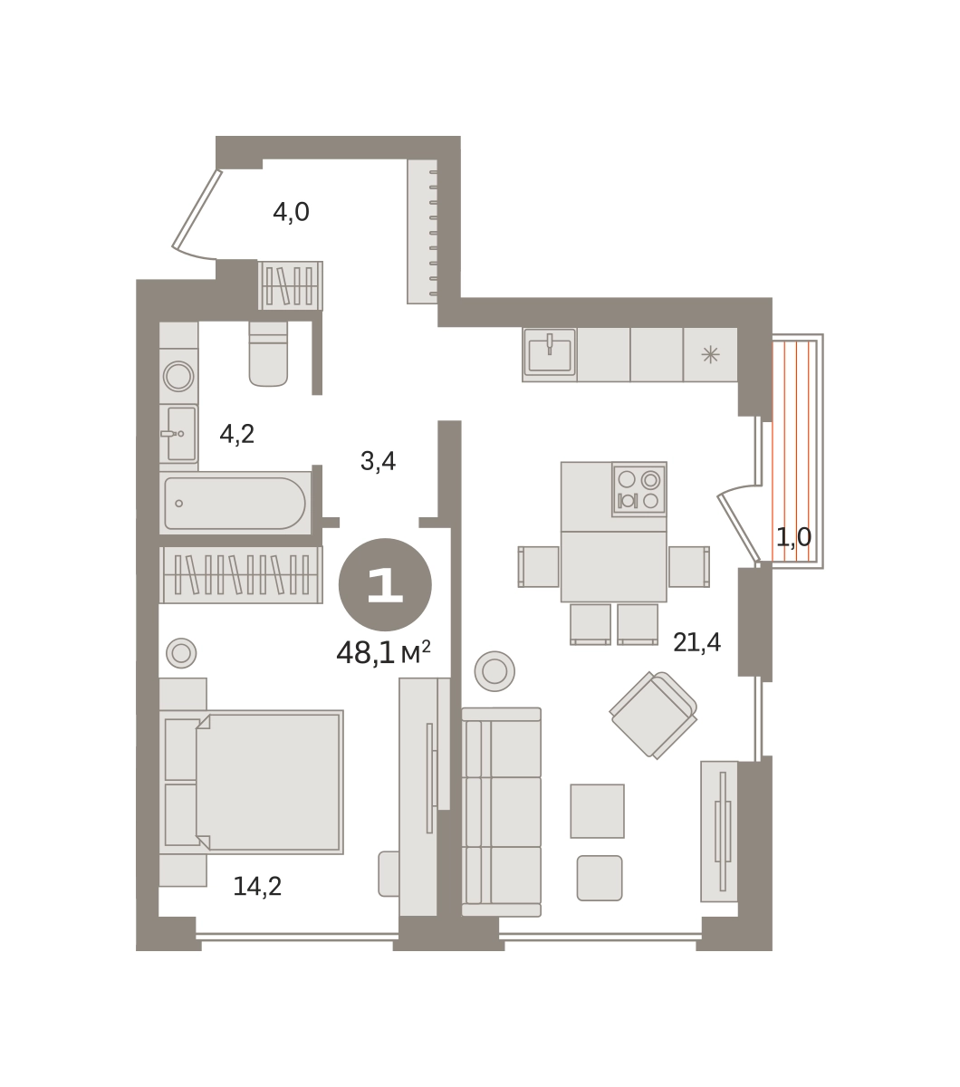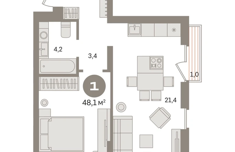 Квартира с кухней-гостиной и одной спальней в «Первом квартале». Особенности планировки: французский балкон, вид во двор, предчистовая отделка. № квартиры в нашей базе: МТК04-Ж3.5.2.О застройщике