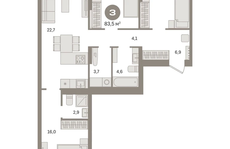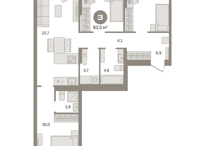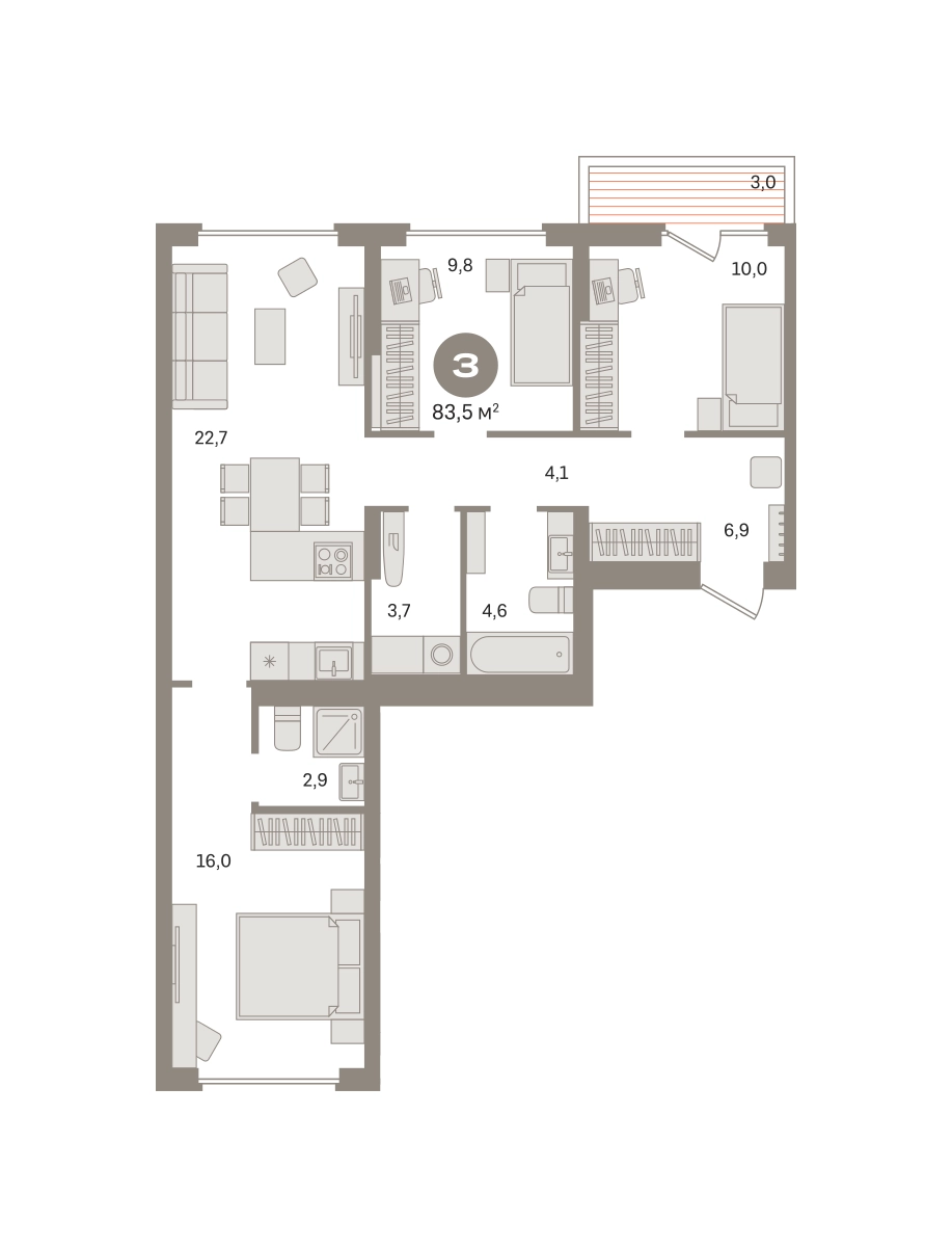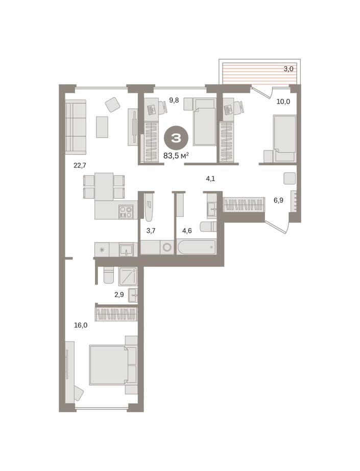 Квартира с кухней-гостиной и тремя спальнями в «Первом квартале». Особенности планировки: окна на две стороны, вид во двор, разнесённые спальни, предчистовая отделка, мастер-спальня, постирочная, балкон. № квартиры в нашей базе: МТК05-Ж3.5.6.О застройщике