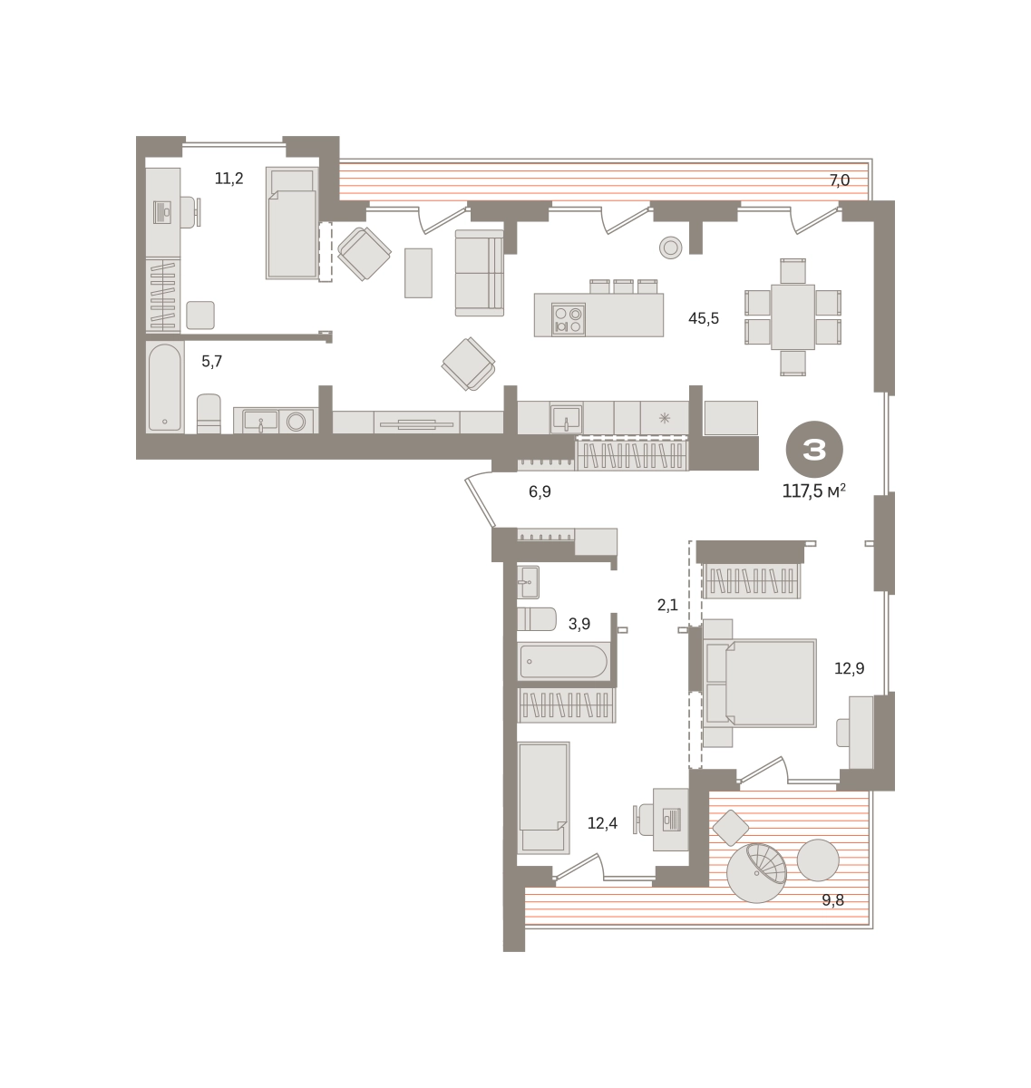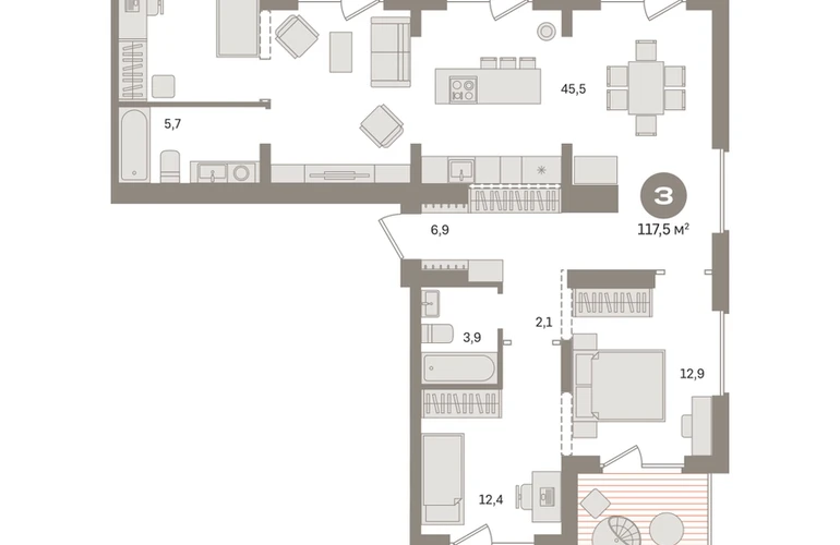 Продаётся с кладовой. Квартира с кухней-гостиной и тремя спальнями в «Первом квартале». Особенности планировки: второй санузел, окно в коридоре, гардеробная, без отделки, вид во двор, свободная планировка, разнесённые спальни, мастер-спальня, терраса. № квартиры в нашей базе: МТК04-Ж3.7.1.О застройщике