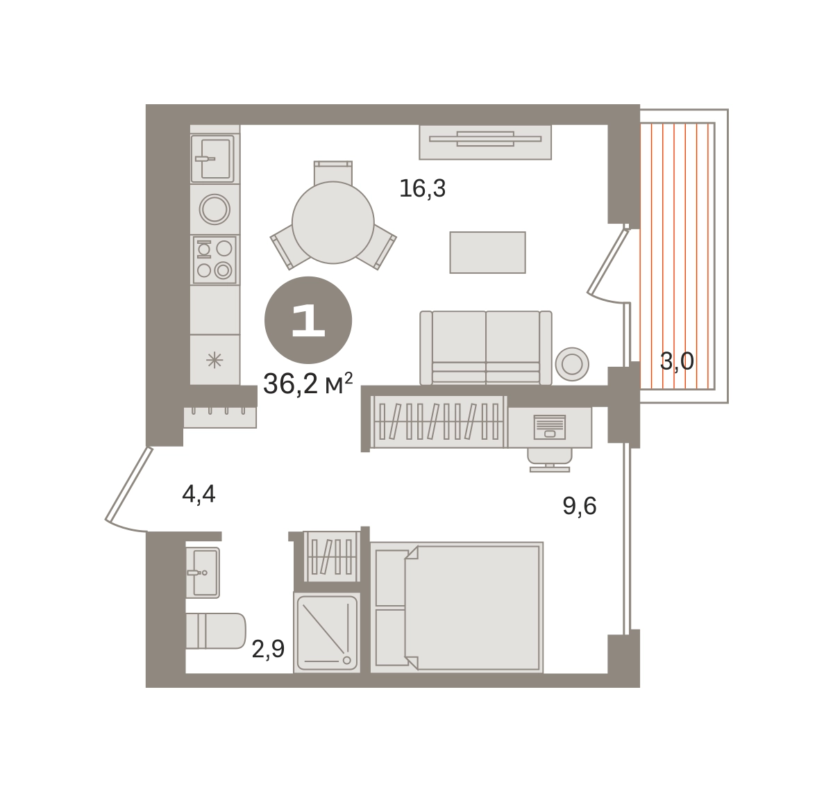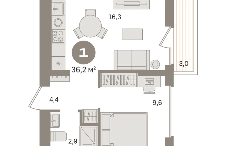 Квартира с кухней-гостиной и одной спальней в «Первом квартале». Особенности планировки: вид во двор, предчистовая отделка, балкон. № квартиры в нашей базе: МТК04-Ж2.3.9.О застройщике