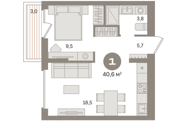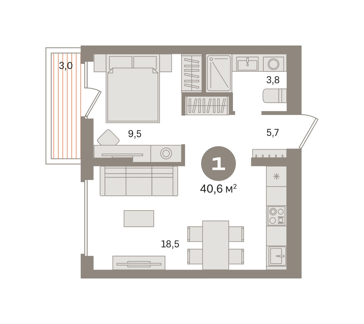 Квартира с кухней-гостиной и одной спальней в «Первом квартале». Особенности планировки: предчистовая отделка, мастер-спальня, балкон. № квартиры в нашей базе: МТК04-Ж2.3.3.О застройщике