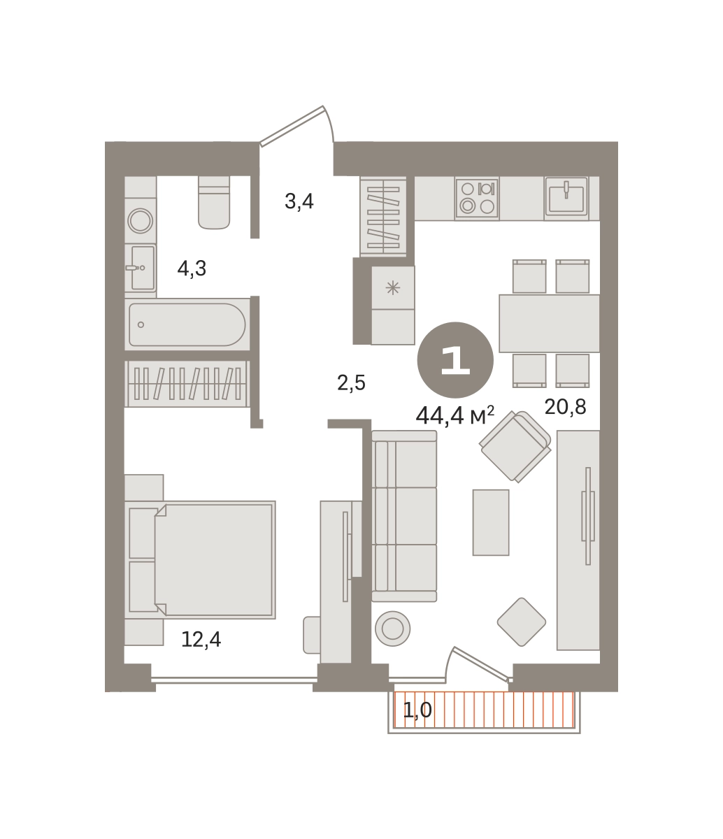 Квартира с кухней-гостиной и одной спальней в «Первом квартале». Особенности планировки: французский балкон, вид во двор, предчистовая отделка. № квартиры в нашей базе: МТК04-Ж3.4.5.О застройщике
