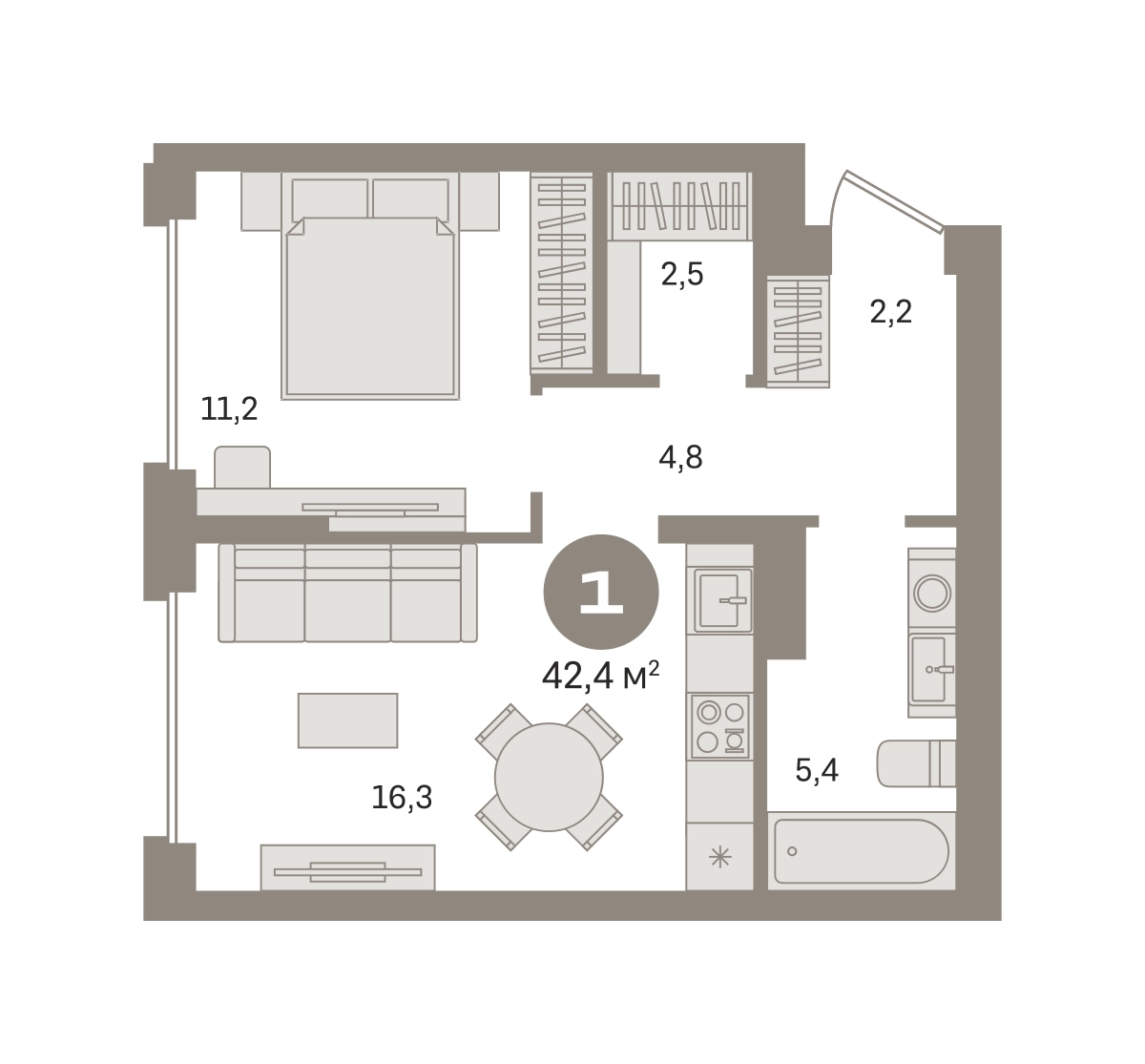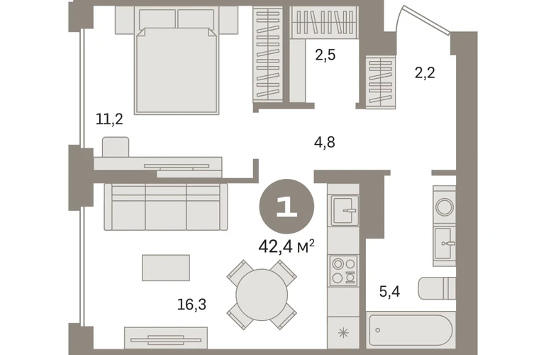 Квартира с кухней-гостиной и одной спальней в «Первом квартале». Особенности планировки: гардеробная, вид во двор, предчистовая отделка. № квартиры в нашей базе: МТК01-Ж4.6.7.О застройщике