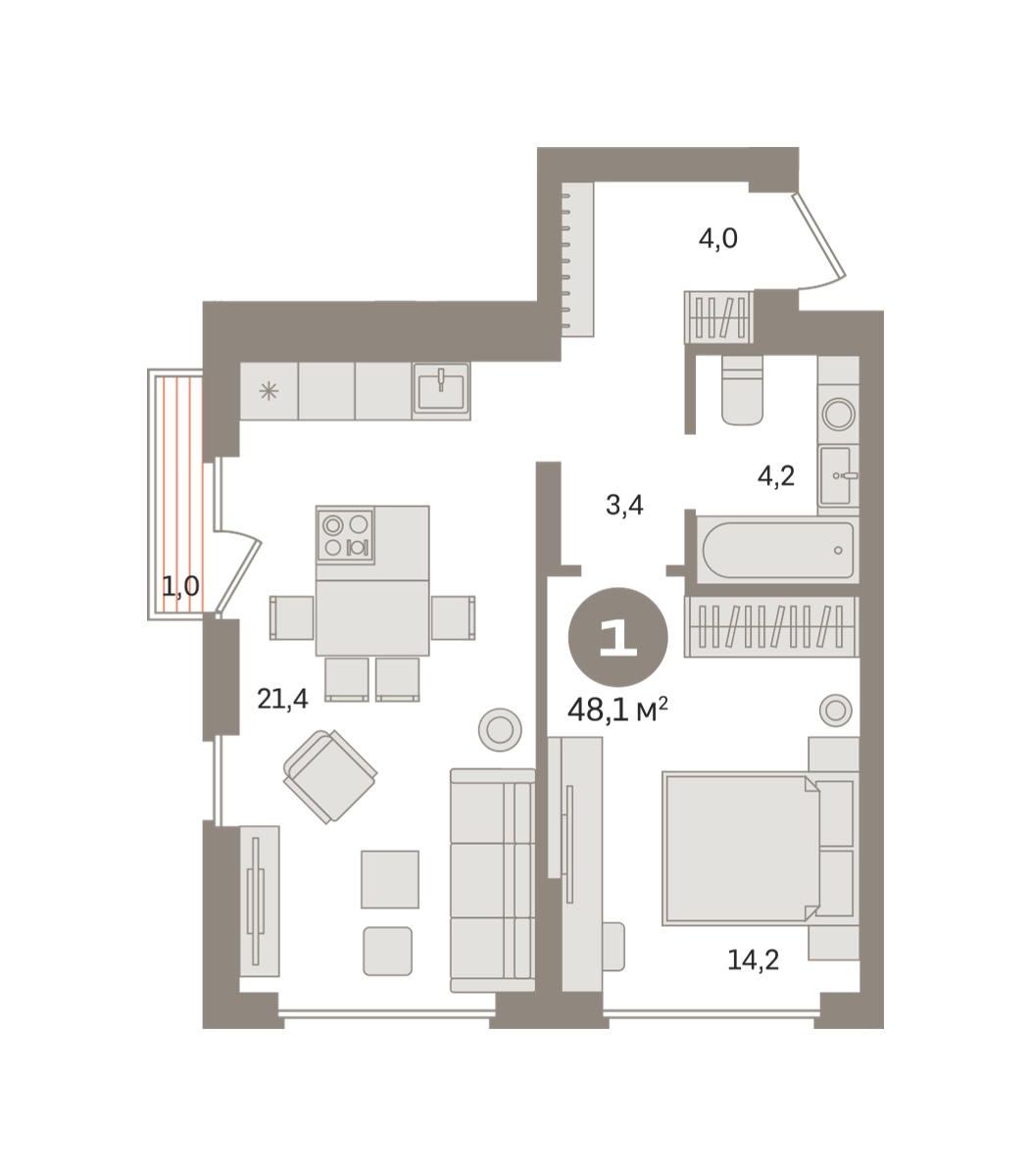 Квартира с кухней-гостиной и одной спальней в «Первом квартале». Особенности планировки: французский балкон, вид во двор, предчистовая отделка. № квартиры в нашей базе: МТК04-Ж3.5.7.О застройщике