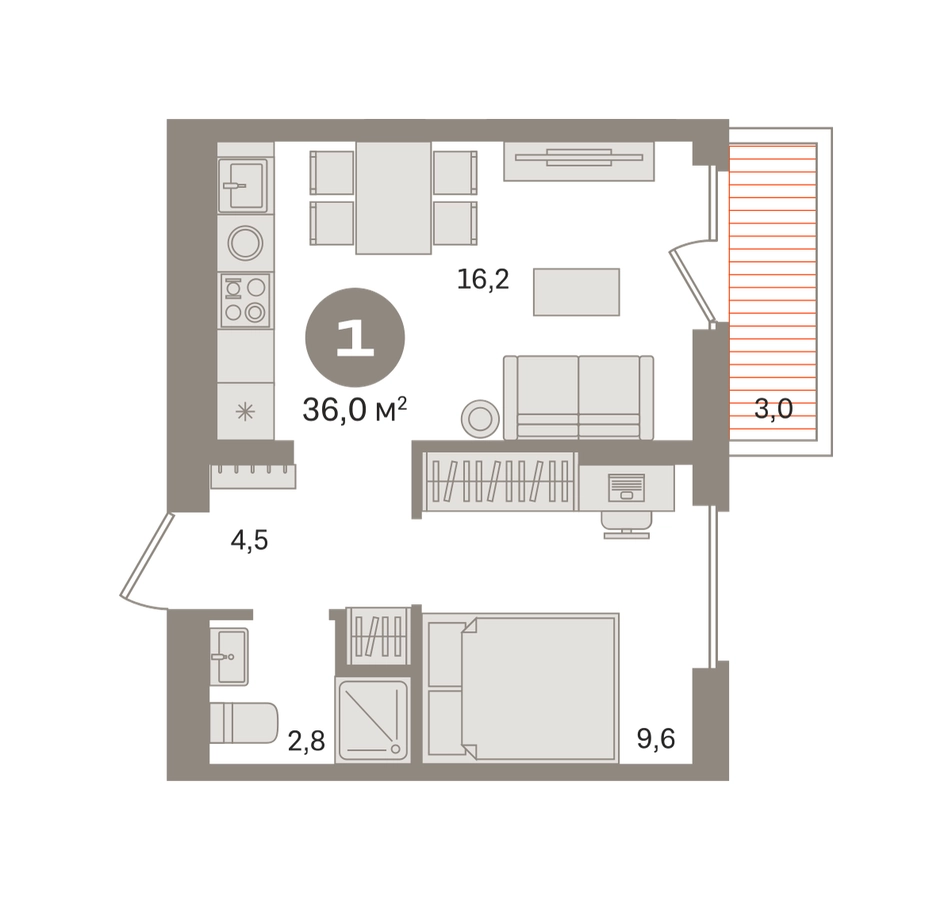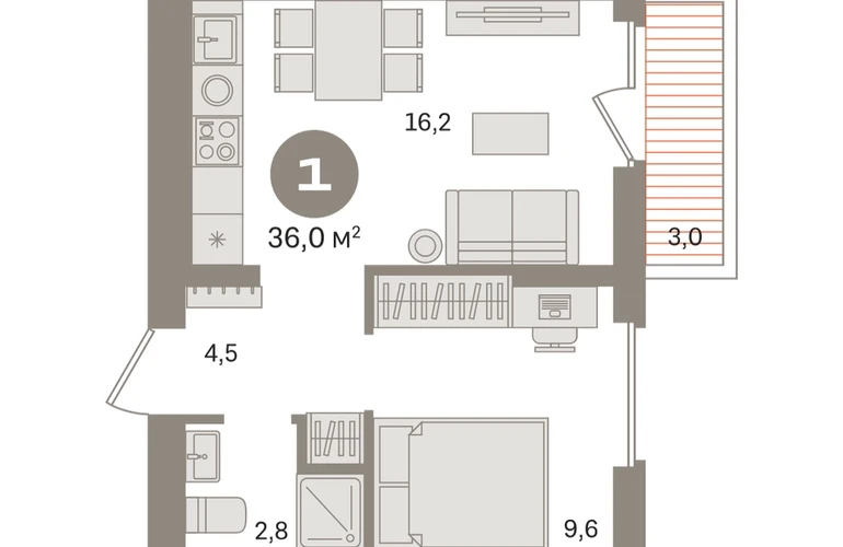 Квартира с кухней-гостиной и одной спальней в «Первом квартале». Особенности планировки: вид во двор, предчистовая отделка, балкон. № квартиры в нашей базе: МТК06-Ж5.4.8.О застройщике