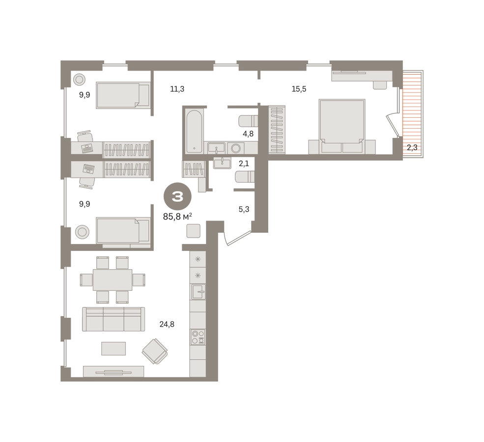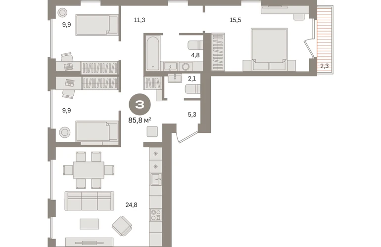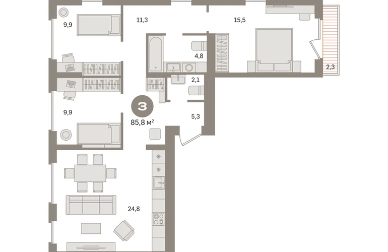 Квартира с кухней-гостиной и тремя спальнями в «Первом квартале». Особенности планировки: второй санузел, окно в коридоре, вид во двор, разнесённые спальни, предчистовая отделка, терраса. № квартиры в нашей базе: МТК06-Ж2.8.1.О застройщике