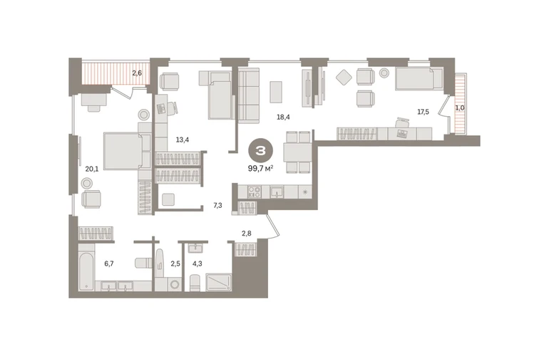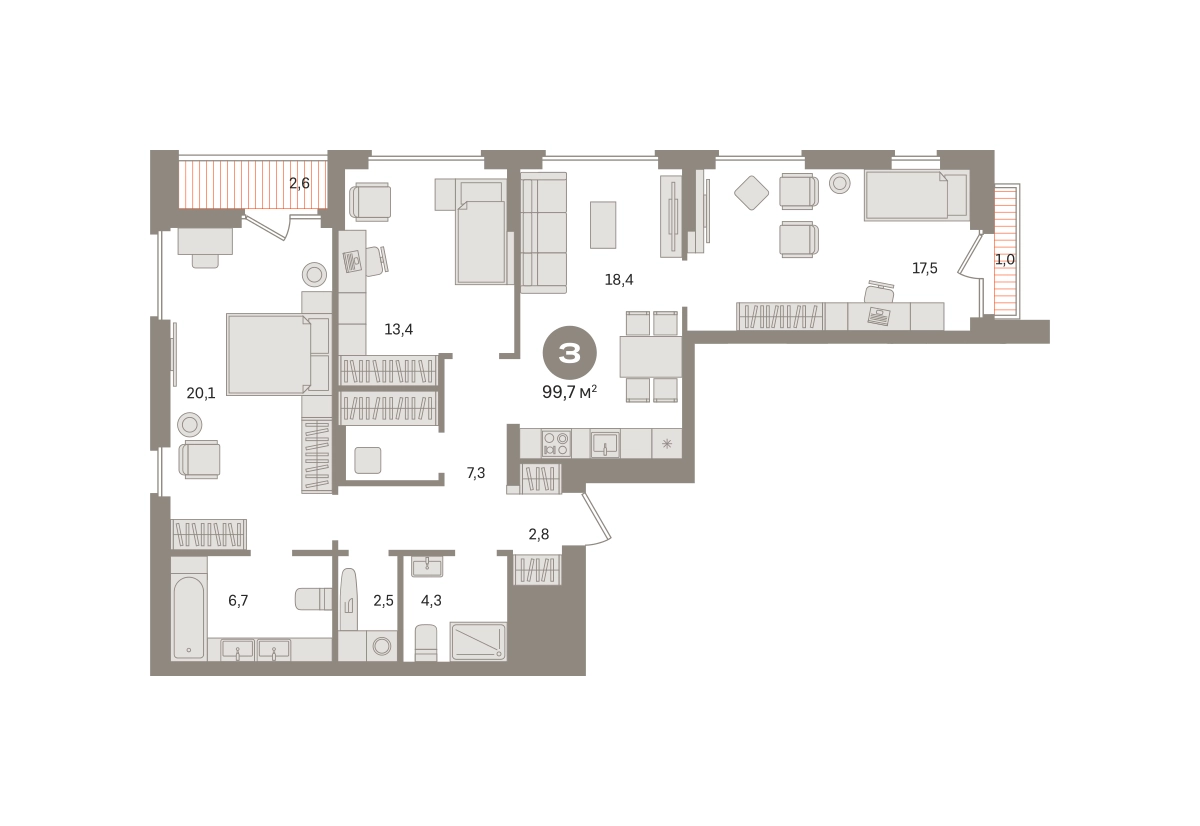 Квартира с кухней-гостиной и тремя спальнями в «Первом квартале». Особенности планировки: второй санузел, гардеробная, французский балкон, вид во двор, лоджия, разнесённые спальни, предчистовая отделка, мастер-спальня, постирочная. № квартиры в нашей базе: МТК06-Ж1.14.1.О застройщике