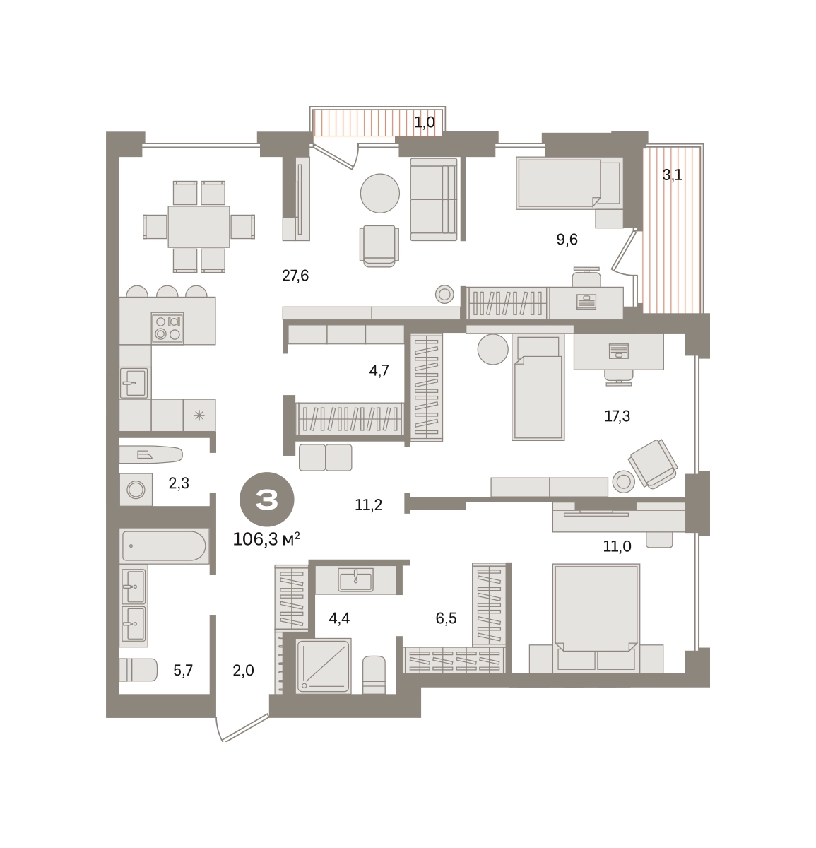 Квартира с кухней-гостиной и тремя спальнями в «Первом квартале». Особенности планировки: гардеробная, французский балкон, лоджия, предчистовая отделка, мастер-спальня, постирочная. № квартиры в нашей базе: МТК07-Ж1.9.3.О застройщике