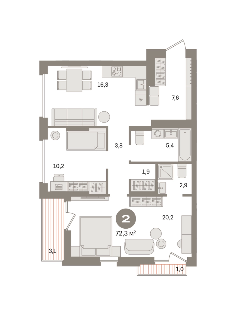 Квартира с кухней-гостиной и двумя спальнями в «Первом квартале». Особенности планировки: второй санузел, гардеробная, французский балкон, вид во двор, лоджия, предчистовая отделка, мастер-спальня. № квартиры в нашей базе: МТК07-Ж1.9.8.О застройщике