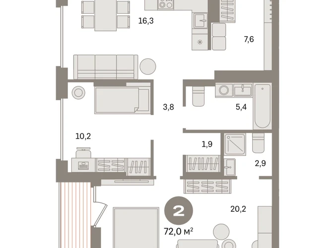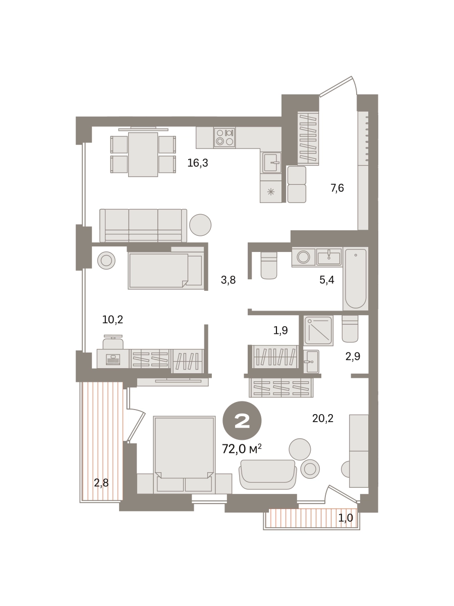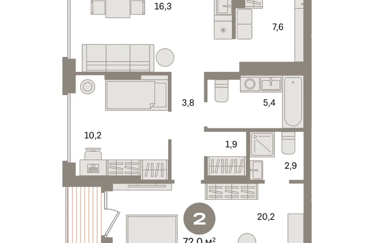 Квартира с кухней-гостиной и двумя спальнями в «Первом квартале». Особенности планировки: второй санузел, гардеробная, французский балкон, вид во двор, лоджия, предчистовая отделка, мастер-спальня. № квартиры в нашей базе: МТК07-Ж1.3.8.О застройщике