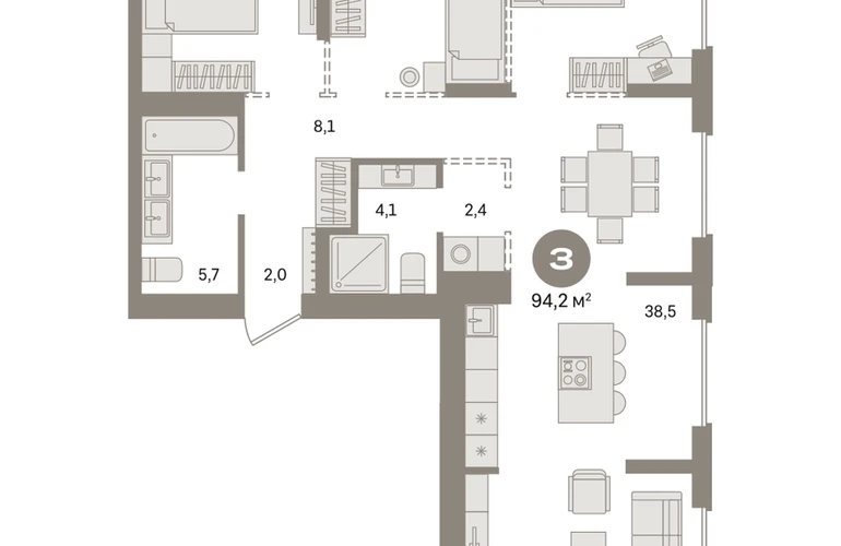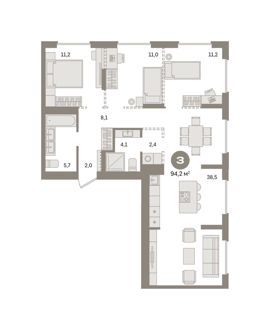Продаётся с кладовой. Квартира с кухней-гостиной и тремя спальнями в «Первом квартале». Особенности планировки: второй санузел, свободная планировка, постирочная. № квартиры в нашей базе: МТК07-Ж1.15.2.О застройщике