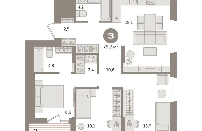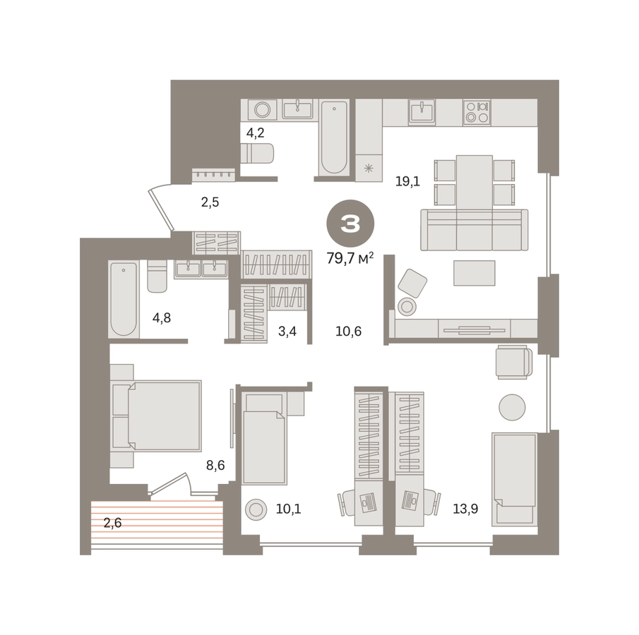 Квартира с кухней-гостиной и тремя спальнями в «Первом квартале». Особенности планировки: второй санузел, гардеробная, вид во двор, лоджия, предчистовая отделка, мастер-спальня. № квартиры в нашей базе: МТК02-Ж1.7.1.О застройщике