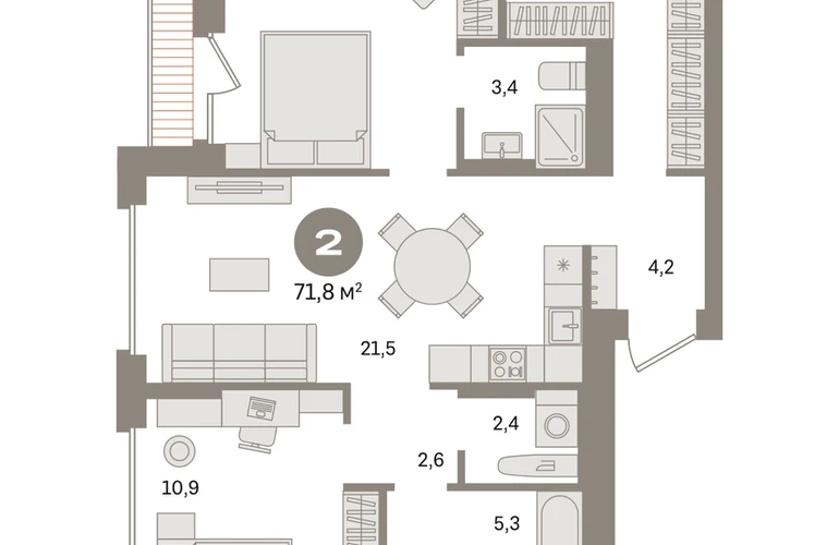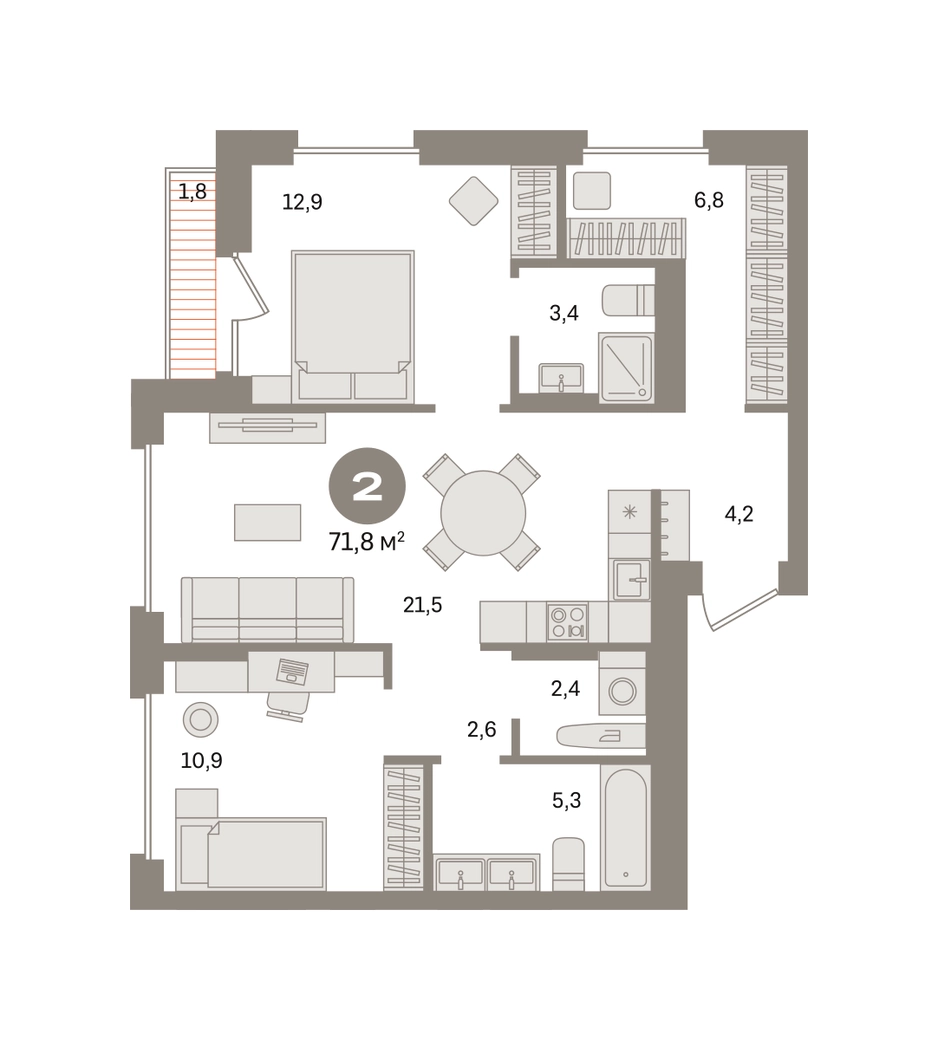 Квартира с кухней-гостиной и двумя спальнями в «Первом квартале». Особенности планировки: второй санузел, гардеробная, разнесённые спальни, предчистовая отделка, мастер-спальня, терраса, постирочная. № квартиры в нашей базе: МТК02-Ж1.13.5.О застройщике