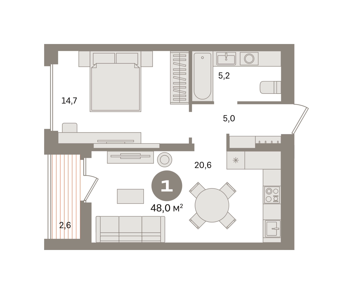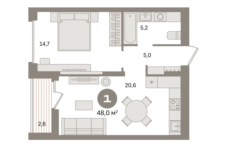 Квартира с кухней-гостиной и одной спальней в «Первом квартале». Особенности планировки: вид во двор, лоджия, предчистовая отделка. № квартиры в нашей базе: МТК02-Ж4.14.7.О застройщике