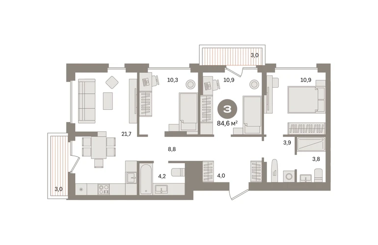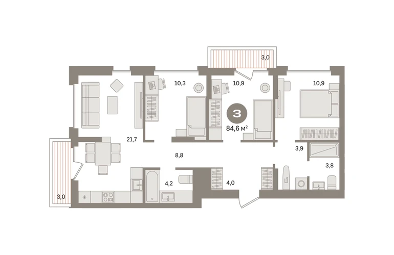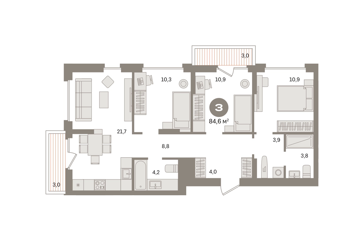 Квартира с кухней-гостиной и тремя спальнями в «Первом квартале». Особенности планировки: второй санузел, рабочий кабинет, разнесённые спальни, предчистовая отделка, постирочная, балкон. № квартиры в нашей базе: МТК02-Ж2.5.7.О застройщике