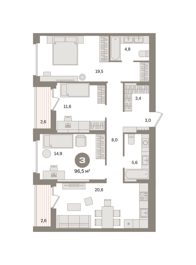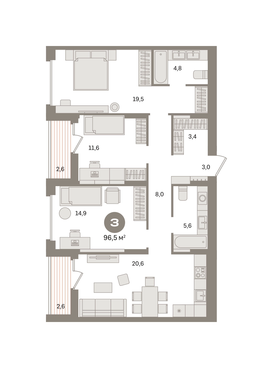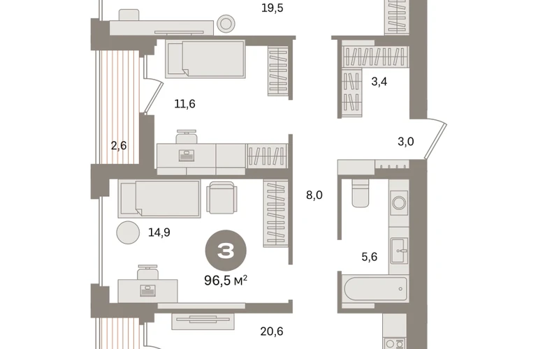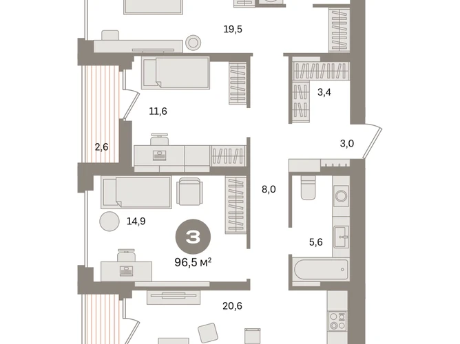 Квартира с кухней-гостиной и тремя спальнями в «Первом квартале». Особенности планировки: гардеробная, вид во двор, лоджия, предчистовая отделка, мастер-спальня. № квартиры в нашей базе: МТК02-Ж4.8.7.О застройщике