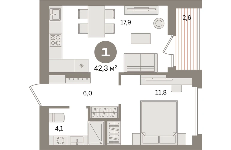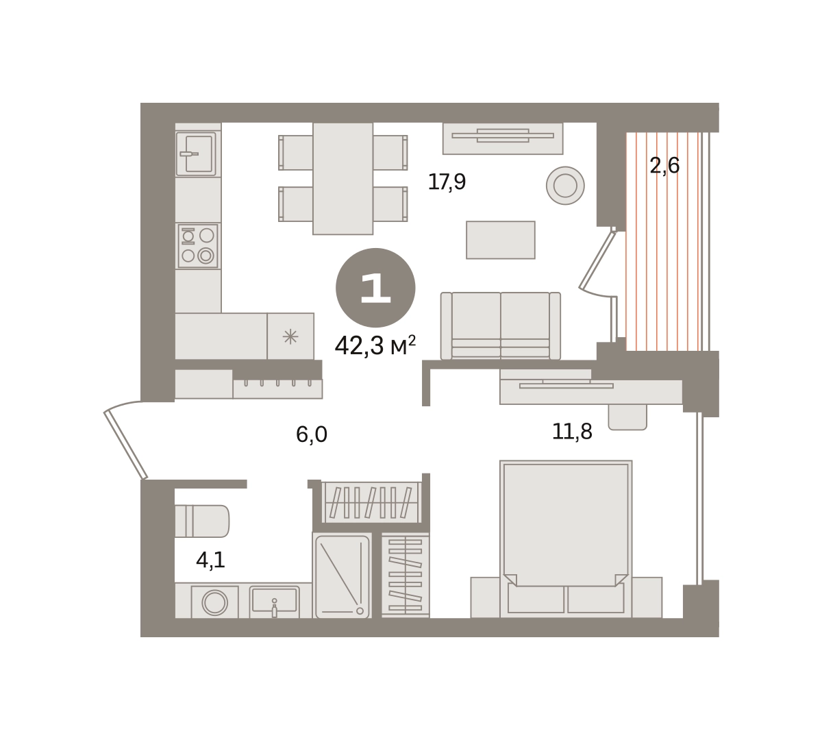 Квартира с кухней-гостиной и одной спальней в «Первом квартале». Особенности планировки: лоджия, предчистовая отделка. № квартиры в нашей базе: МТК02-Ж4.15.4.О застройщике