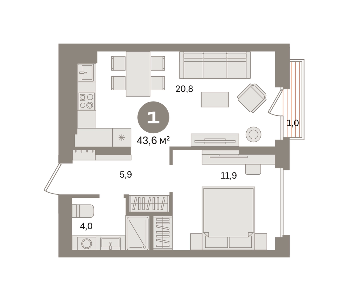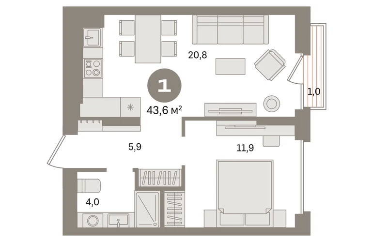 Квартира с кухней-гостиной и одной спальней в «Первом квартале». Особенности планировки: французский балкон, предчистовая отделка. № квартиры в нашей базе: МТК02-Ж4.9.2.О застройщике
