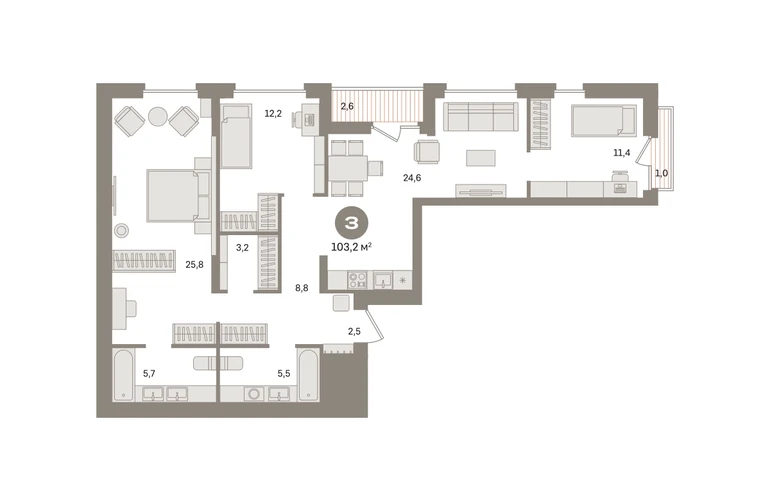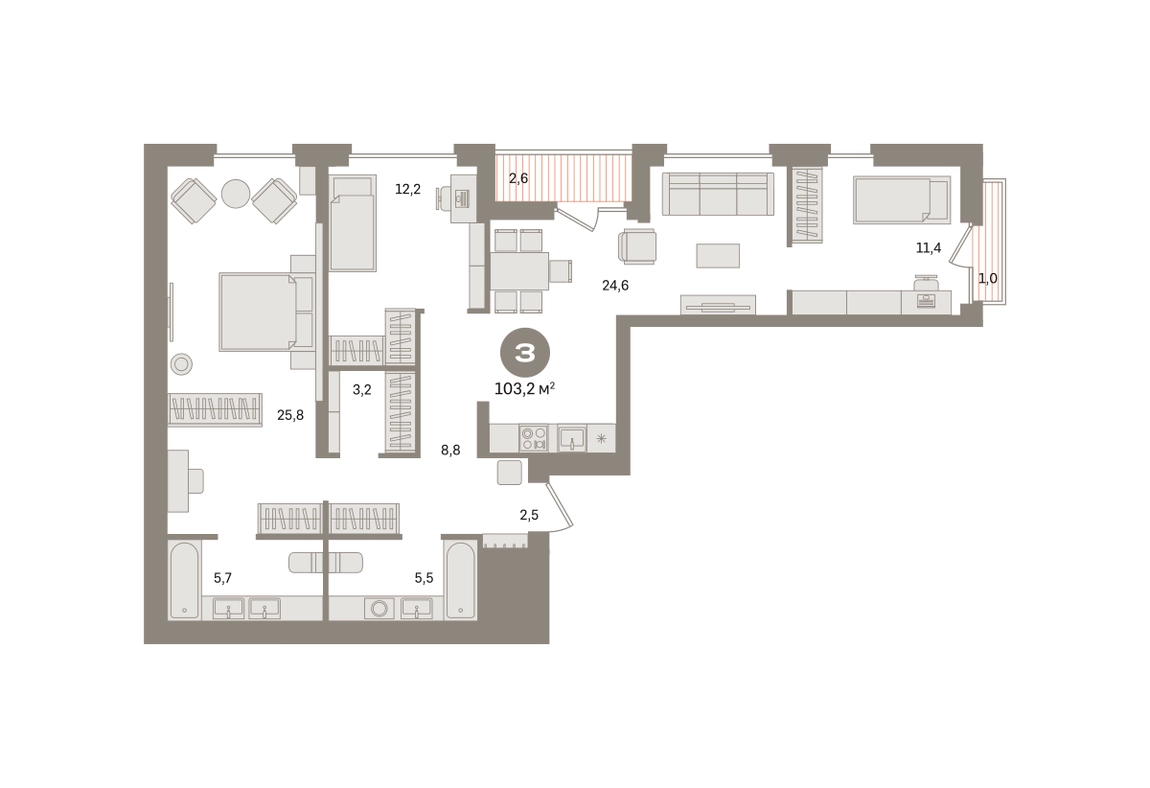 Квартира с кухней-гостиной и тремя спальнями в «Первом квартале». Особенности планировки: гардеробная, французский балкон, лоджия, разнесённые спальни, предчистовая отделка, мастер-спальня. № квартиры в нашей базе: МТК02-Ж4.10.1.О застройщике
