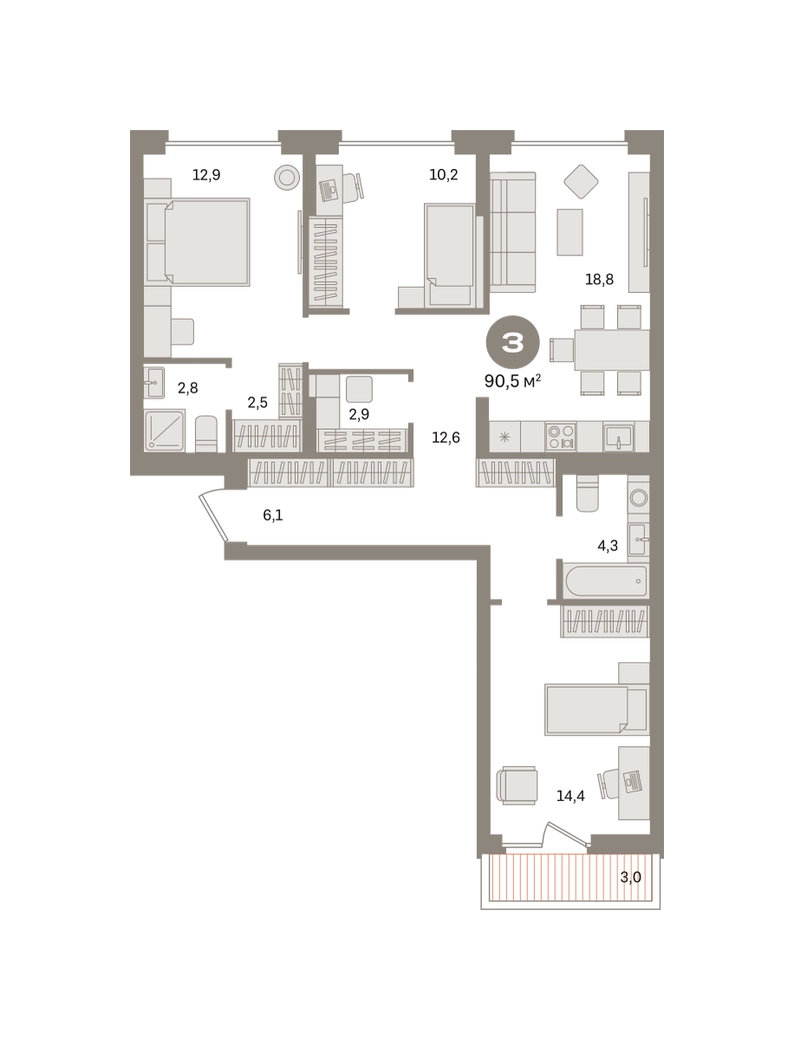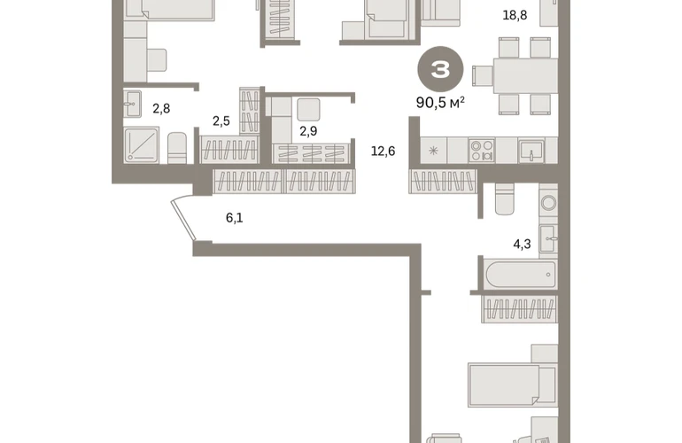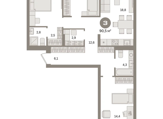 Квартира с кухней-гостиной и тремя спальнями в «Первом квартале». Особенности планировки: окна на две стороны, гардеробная, вид во двор, разнесённые спальни, предчистовая отделка, мастер-спальня, балкон. № квартиры в нашей базе: МТК02-Ж2.4.8.О застройщике
