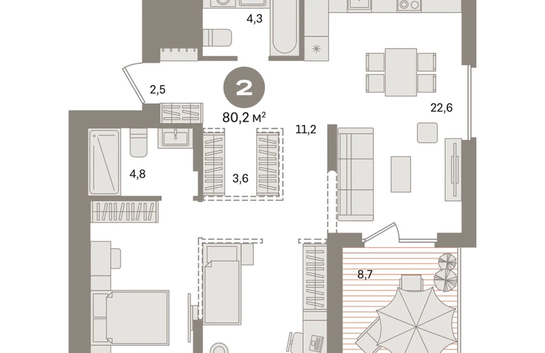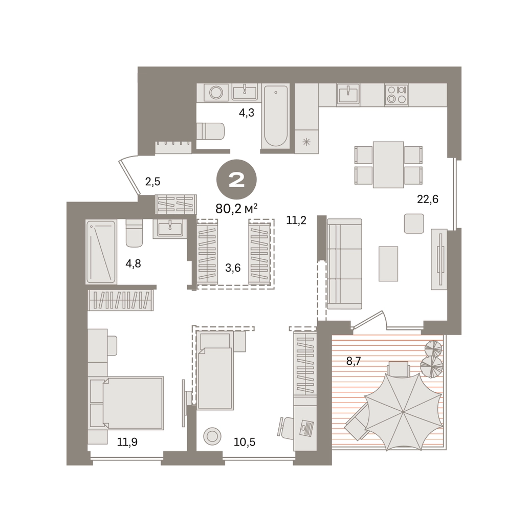 Квартира с кухней-гостиной и двумя спальнями в «Первом квартале». Особенности планировки: второй санузел, гардеробная, без отделки, вид во двор, свободная планировка, мастер-спальня, терраса. № квартиры в нашей базе: МТК02-Ж1.16.1.О застройщике