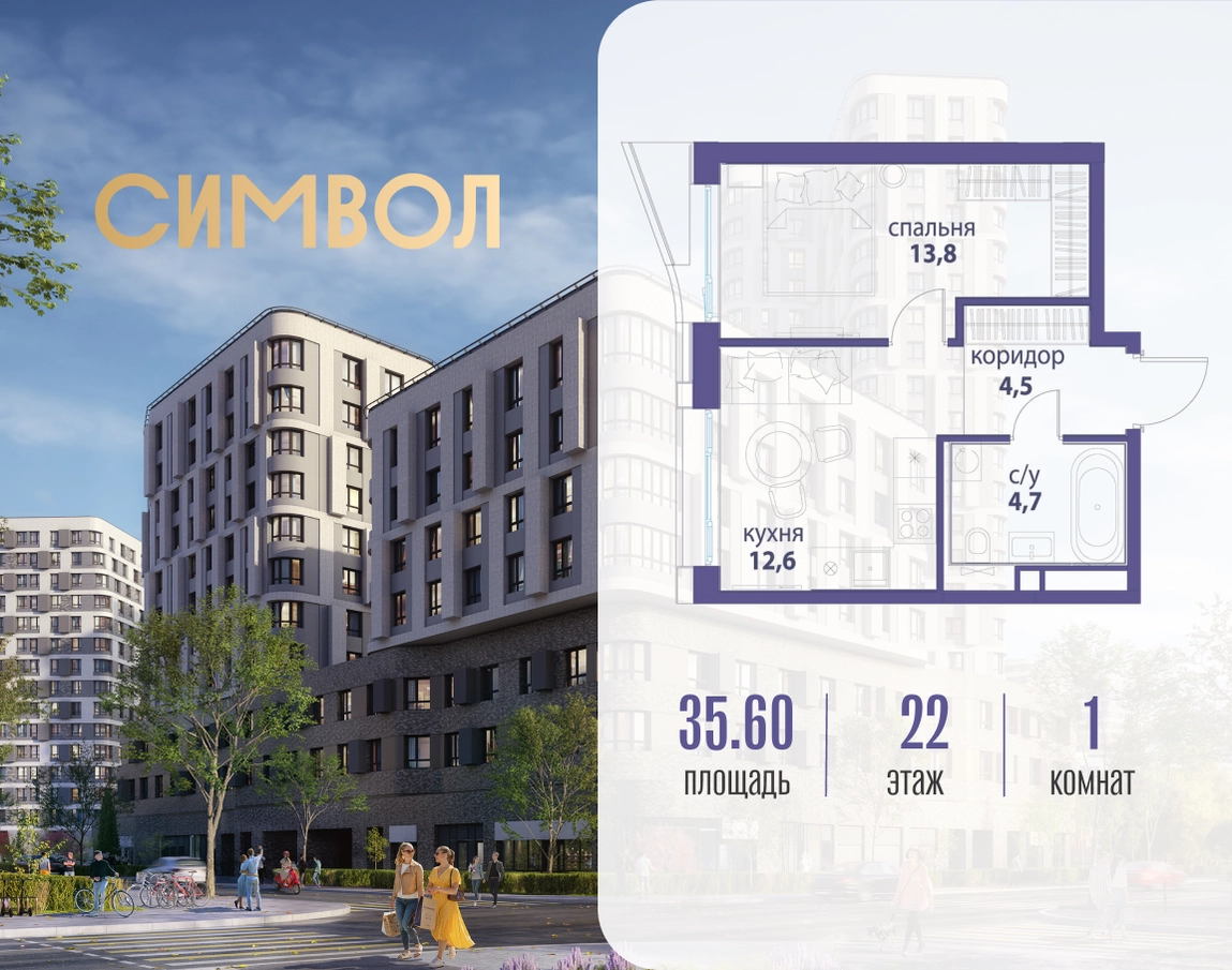 Продается 1-комнатная квартира от застройщика: общая площадь 35.60 м², жилая 13.80 м², кухня 12.60 м², 22-й этаж, жилой квартал «Вдохновение», корпус 33 (секция 3). Срок сдачи: 4 квартал 2027 года. Позвоните сейчас и забронируйте квартиру! Квартал бизнес-класса СИМВОЛ — это городское пространство нового поколения в историческом районе Лефортово, на границе ЦАО, в 2 км от Садового кольца. Бионическая архитектура СИМВОЛА превратила Лефортово в суперсовременное и модное пространство. Из окон, с балконов и террас просторных квартир СИМВОЛА открываются отличные виды на город и новый парк «Зеленая река», «протекающий» через все кварталы комплекса на 2 км. В квартале уже есть все, что нужно для комфортной жизни: кафе и рестораны, супермаркеты и магазины, медицинские и физкультурно-оздоровительные центры, салоны красоты и барбершопы, аптеки и оптики, химчистки, пункты доставки и другие сервисы — всего более 90 действующих объектов внутриквартальной инфраструктуры. Для юных жителей СИМВОЛА открыты детский сад и инженерный лицей при МГТУ им. Баумана. Особенности квартала: • Свой парк «Зеленая Река» - 10 га зелени и развлечений на любой вкус! • Уникальная для Москвы архитектура - Проект создан архитектурной мастерской ATRIUM по дизайн-коду британских бюро LDA Design и UHA London. • Богатая инфраструктура с детскими садами и лицеем им. Баумана, кафе и ресторанами, супермаркетами и аптеками, зоной для фитнеса, бассейном и мед. центром. • Квартиры с панорамными окнами, террасами, ванными с окнами и каминами редких форматов. • Закрытые безопасные зелёные дворы-парки без машин!О застройщике
