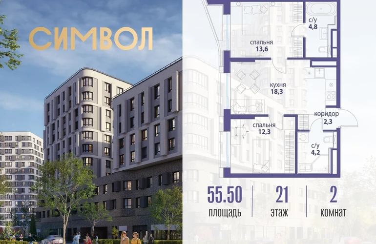 Продается 2-комнатная квартира от застройщика: общая площадь 55.50 м², жилая 25.90 м², кухня 18.30 м², 21-й этаж, жилой квартал «Вдохновение», корпус 33 (секция 3). Срок сдачи: 4 квартал 2027 года. Позвоните сейчас и забронируйте квартиру! Квартал бизнес-класса СИМВОЛ — это городское пространство нового поколения в историческом районе Лефортово, на границе ЦАО, в 2 км от Садового кольца. Бионическая архитектура СИМВОЛА превратила Лефортово в суперсовременное и модное пространство. Из окон, с балконов и террас просторных квартир СИМВОЛА открываются отличные виды на город и новый парк «Зеленая река», «протекающий» через все кварталы комплекса на 2 км. В квартале уже есть все, что нужно для комфортной жизни: кафе и рестораны, супермаркеты и магазины, медицинские и физкультурно-оздоровительные центры, салоны красоты и барбершопы, аптеки и оптики, химчистки, пункты доставки и другие сервисы — всего более 90 действующих объектов внутриквартальной инфраструктуры. Для юных жителей СИМВОЛА открыты детский сад и инженерный лицей при МГТУ им. Баумана. Особенности квартала: • Свой парк «Зеленая Река» - 10 га зелени и развлечений на любой вкус! • Уникальная для Москвы архитектура - Проект создан архитектурной мастерской ATRIUM по дизайн-коду британских бюро LDA Design и UHA London. • Богатая инфраструктура с детскими садами и лицеем им. Баумана, кафе и ресторанами, супермаркетами и аптеками, зоной для фитнеса, бассейном и мед. центром. • Квартиры с панорамными окнами, террасами, ванными с окнами и каминами редких форматов. • Закрытые безопасные зелёные дворы-парки без машин!О застройщике