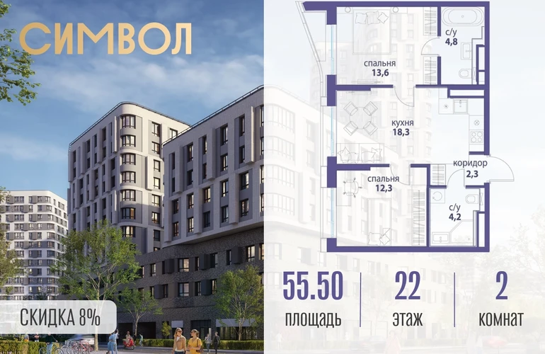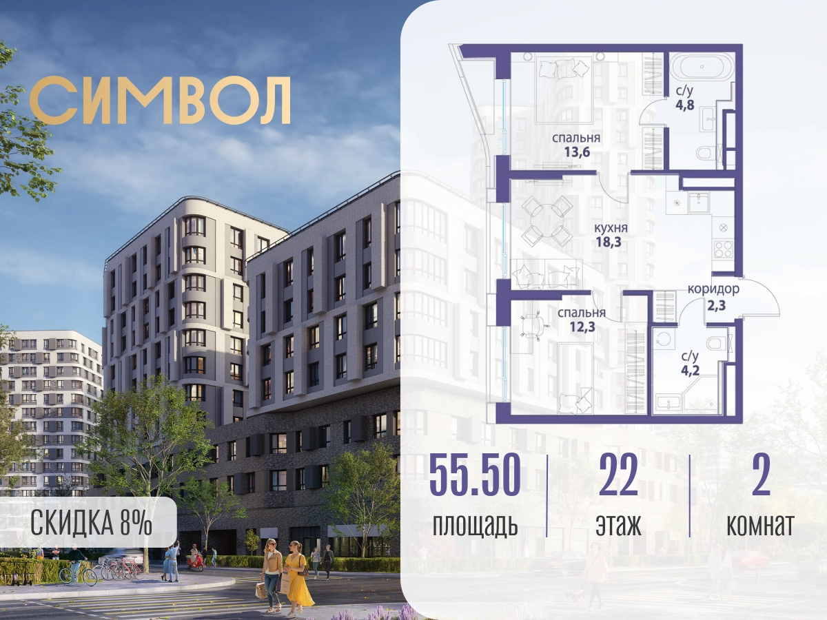Продается 2-комнатная квартира от застройщика: общая площадь 55.50 м², жилая 25.90 м², кухня 18.30 м², 22-й этаж, жилой квартал «Вдохновение», корпус 33 (секция 3). Срок сдачи: 4 квартал 2027 года. Позвоните сейчас и забронируйте квартиру! Квартал бизнес-класса СИМВОЛ — это городское пространство нового поколения в историческом районе Лефортово, на границе ЦАО, в 2 км от Садового кольца. Бионическая архитектура СИМВОЛА превратила Лефортово в суперсовременное и модное пространство. Из окон, с балконов и террас просторных квартир СИМВОЛА открываются отличные виды на город и новый парк «Зеленая река», «протекающий» через все кварталы комплекса на 2 км. В квартале уже есть все, что нужно для комфортной жизни: кафе и рестораны, супермаркеты и магазины, медицинские и физкультурно-оздоровительные центры, салоны красоты и барбершопы, аптеки и оптики, химчистки, пункты доставки и другие сервисы — всего более 90 действующих объектов внутриквартальной инфраструктуры. Для юных жителей СИМВОЛА открыты детский сад и инженерный лицей при МГТУ им. Баумана. Особенности квартала: • Свой парк «Зеленая Река» - 10 га зелени и развлечений на любой вкус! • Уникальная для Москвы архитектура - Проект создан архитектурной мастерской ATRIUM по дизайн-коду британских бюро LDA Design и UHA London. • Богатая инфраструктура с детскими садами и лицеем им. Баумана, кафе и ресторанами, супермаркетами и аптеками, зоной для фитнеса, бассейном и мед. центром. • Квартиры с панорамными окнами, террасами, ванными с окнами и каминами редких форматов. • Закрытые безопасные зелёные дворы-парки без машин!О застройщике