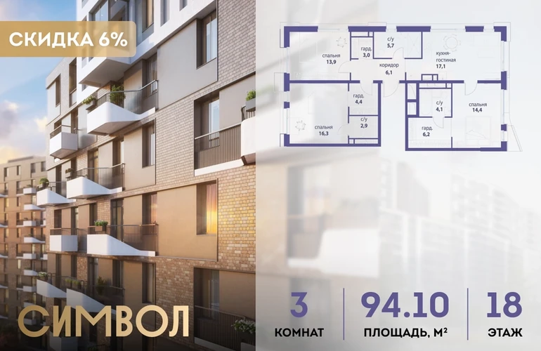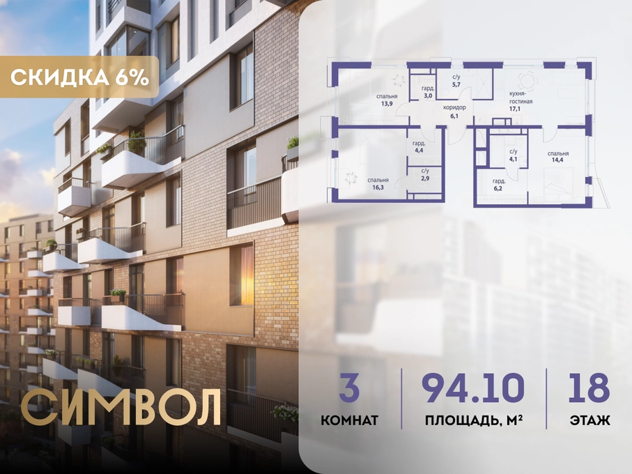 Продается 3-комнатная квартира от застройщика: общая площадь 94.10 м², жилая 44.60 м², кухня 18.70 м², 18-й этаж, жилой квартал «Вдохновение», корпус 32 (секция 1). Срок сдачи: 4 квартал 2027 года. <br> <br>Действует большой выбор скидок и ипотечных программ: вы можете выбрать те, что подходят именно вам. <br> <br>Акции и рассрочка: <br>• Видовые квартиры. Старт продаж! <br>• Беспроцентная рассрочка! <br> <br>Позвоните сейчас и забронируйте квартиру! <br> <br>Квартал бизнес-класса СИМВОЛ — это городское пространство нового поколения в историческом районе Лефортово, на границе ЦАО, в 2 км от Садового кольца. <br>Бионическая архитектура СИМВОЛА превратила Лефортово в суперсовременное и модное пространство. Из окон, с балконов и террас просторных квартир СИМВОЛА открываются отличные виды на город и новый парк «Зеленая река», «протекающий» через все кварталы комплекса на 2 км. <br>В квартале уже есть все, что нужно для комфортной жизни: кафе и рестораны, супермаркеты и магазины, медицинские и физкультурно-оздоровительные центры, салоны красоты и барбершопы, аптеки и оптики, химчистки, пункты доставки и другие сервисы — всего более 90 действующих объектов внутриквартальной инфраструктуры. <br>Для юных жителей СИМВОЛА открыты детский сад и инженерный лицей при МГТУ им. Баумана. <br> <br>Особенности квартала: <br>• Свой парк «Зеленая Река» - 10 га зелени и развлечений на любой вкус! <br>• Уникальная для Москвы архитектура - Проект создан архитектурной мастерской ATRIUM по дизайн-коду британских бюро LDA Design и UHA London. <br>• Богатая инфраструктура с детскими садами и лицеем им. Баумана, кафе и ресторанами, супермаркетами и аптеками, зоной для фитнеса, бассейном и мед. центром. <br>• Квартиры с панорамными окнами, террасами, ванными с окнами и каминами редких форматов. <br>• Закрытые безопасные зелёные дворы-парки без машин!О застройщике
