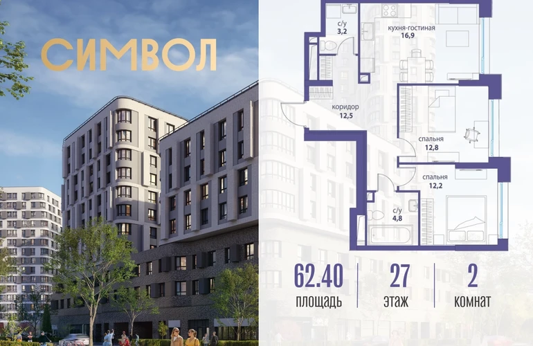 Продается 2-комнатная квартира от застройщика: общая площадь 62.40 м², жилая 25.00 м², кухня 16.90 м², 27-й этаж, жилой квартал «Вдохновение», корпус 30 (секция 1). Срок сдачи: 1 квартал 2026 года. Позвоните сейчас и забронируйте квартиру! Квартал бизнес-класса СИМВОЛ — это городское пространство нового поколения в историческом районе Лефортово, на границе ЦАО, в 2 км от Садового кольца. Бионическая архитектура СИМВОЛА превратила Лефортово в суперсовременное и модное пространство. Из окон, с балконов и террас просторных квартир СИМВОЛА открываются отличные виды на город и новый парк «Зеленая река», «протекающий» через все кварталы комплекса на 2 км. В квартале уже есть все, что нужно для комфортной жизни: кафе и рестораны, супермаркеты и магазины, медицинские и физкультурно-оздоровительные центры, салоны красоты и барбершопы, аптеки и оптики, химчистки, пункты доставки и другие сервисы — всего более 90 действующих объектов внутриквартальной инфраструктуры. Для юных жителей СИМВОЛА открыты детский сад и инженерный лицей при МГТУ им. Баумана. Особенности квартала: • Свой парк «Зеленая Река» - 10 га зелени и развлечений на любой вкус! • Уникальная для Москвы архитектура - Проект создан архитектурной мастерской ATRIUM по дизайн-коду британских бюро LDA Design и UHA London. • Богатая инфраструктура с детскими садами и лицеем им. Баумана, кафе и ресторанами, супермаркетами и аптеками, зоной для фитнеса, бассейном и мед. центром. • Квартиры с панорамными окнами, террасами, ванными с окнами и каминами редких форматов. • Закрытые безопасные зелёные дворы-парки без машин!О застройщике