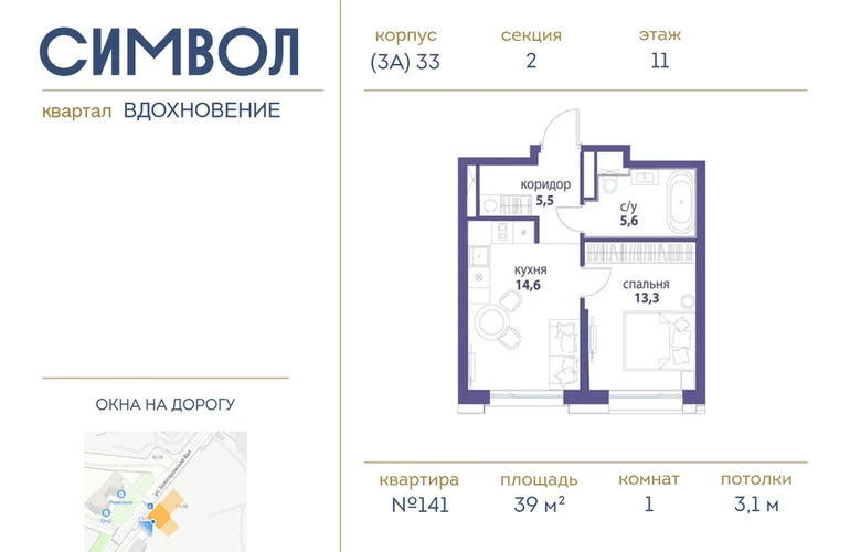 Продается 1-комнатная квартира от застройщика: общая площадь 39.00 м², жилая 13.30 м², кухня 14.60 м², 11-й этаж, жилой квартал «Вдохновение», корпус 33 (секция 2). Срок сдачи: 4 квартал 2027 года. <br> <br>Действует большой выбор скидок и ипотечных программ: вы можете выбрать те, что подходят именно вам. <br> <br>Акции и рассрочка: <br>• Видовые квартиры. Старт продаж! <br>• Беспроцентная рассрочка! <br> <br>Позвоните сейчас и забронируйте квартиру! <br> <br>Квартал бизнес-класса СИМВОЛ — это городское пространство нового поколения в историческом районе Лефортово, на границе ЦАО, в 2 км от Садового кольца. <br>Бионическая архитектура СИМВОЛА превратила Лефортово в суперсовременное и модное пространство. Из окон, с балконов и террас просторных квартир СИМВОЛА открываются отличные виды на город и новый парк «Зеленая река», «протекающий» через все кварталы комплекса на 2 км. <br>В квартале уже есть все, что нужно для комфортной жизни: кафе и рестораны, супермаркеты и магазины, медицинские и физкультурно-оздоровительные центры, салоны красоты и барбершопы, аптеки и оптики, химчистки, пункты доставки и другие сервисы — всего более 90 действующих объектов внутриквартальной инфраструктуры. <br>Для юных жителей СИМВОЛА открыты детский сад и инженерный лицей при МГТУ им. Баумана. <br> <br>Особенности квартала: <br>• Свой парк «Зеленая Река» - 10 га зелени и развлечений на любой вкус! <br>• Уникальная для Москвы архитектура - Проект создан архитектурной мастерской ATRIUM по дизайн-коду британских бюро LDA Design и UHA London. <br>• Богатая инфраструктура с детскими садами и лицеем им. Баумана, кафе и ресторанами, супермаркетами и аптеками, зоной для фитнеса, бассейном и мед. центром. <br>• Квартиры с панорамными окнами, террасами, ванными с окнами и каминами редких форматов. <br>• Закрытые безопасные зелёные дворы-парки без машин!О застройщике