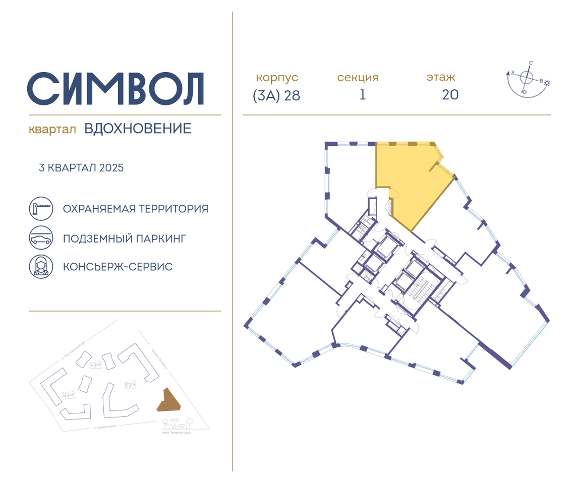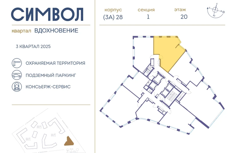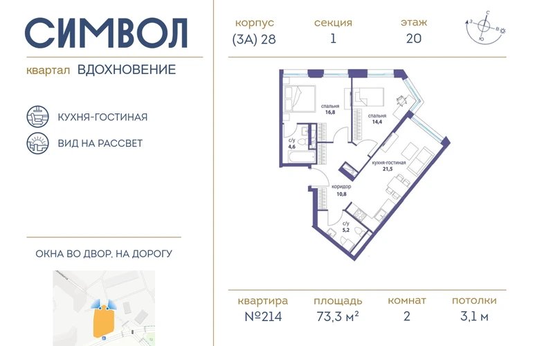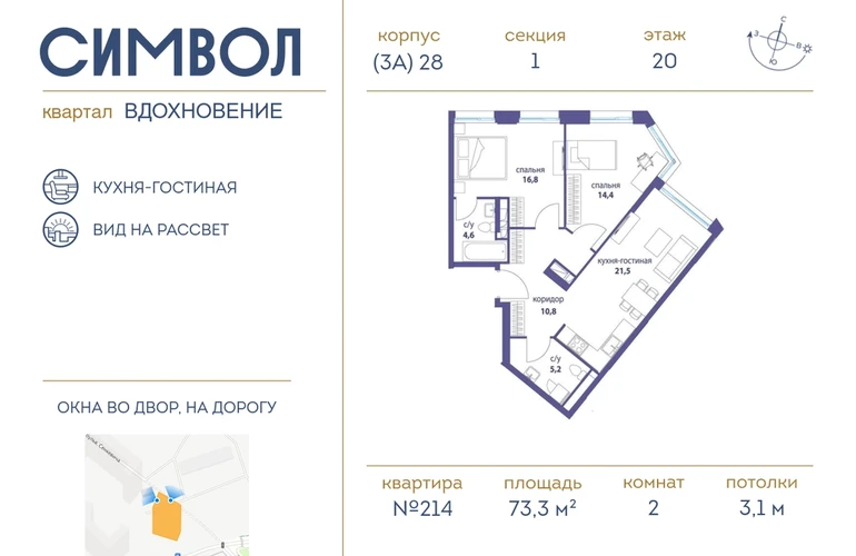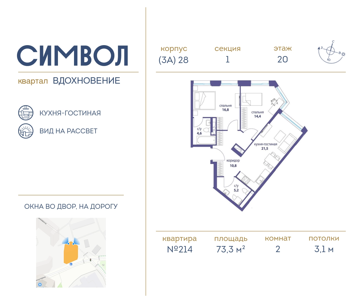 Продается 2-комнатная квартира от застройщика: общая площадь 73.30 м², жилая 31.20 м², кухня 21.50 м², 20-й этаж, жилой квартал «Вдохновение», корпус 28 (секция 1). Срок сдачи: 3 квартал 2025 года. <br> <br>Действует большой выбор скидок и ипотечных программ: вы можете выбрать те, что подходят именно вам. <br> <br>Акции и рассрочка: <br>• Видовые квартиры. Старт продаж! <br>• Беспроцентная рассрочка! <br> <br>Позвоните сейчас и забронируйте квартиру! <br> <br>Квартал бизнес-класса СИМВОЛ — это городское пространство нового поколения в историческом районе Лефортово, на границе ЦАО, в 2 км от Садового кольца. <br>Бионическая архитектура СИМВОЛА превратила Лефортово в суперсовременное и модное пространство. Из окон, с балконов и террас просторных квартир СИМВОЛА открываются отличные виды на город и новый парк «Зеленая река», «протекающий» через все кварталы комплекса на 2 км. <br>В квартале уже есть все, что нужно для комфортной жизни: кафе и рестораны, супермаркеты и магазины, медицинские и физкультурно-оздоровительные центры, салоны красоты и барбершопы, аптеки и оптики, химчистки, пункты доставки и другие сервисы — всего более 90 действующих объектов внутриквартальной инфраструктуры. <br>Для юных жителей СИМВОЛА открыты детский сад и инженерный лицей при МГТУ им. Баумана. <br> <br>Особенности квартала: <br>• Свой парк «Зеленая Река» - 10 га зелени и развлечений на любой вкус! <br>• Уникальная для Москвы архитектура - Проект создан архитектурной мастерской ATRIUM по дизайн-коду британских бюро LDA Design и UHA London. <br>• Богатая инфраструктура с детскими садами и лицеем им. Баумана, кафе и ресторанами, супермаркетами и аптеками, зоной для фитнеса, бассейном и мед. центром. <br>• Квартиры с панорамными окнами, террасами, ванными с окнами и каминами редких форматов. <br>• Закрытые безопасные зелёные дворы-парки без машин!О застройщике