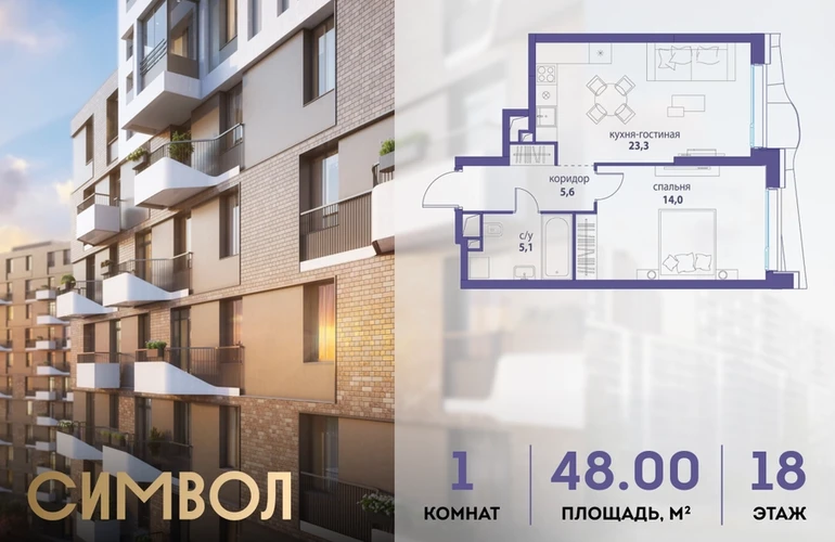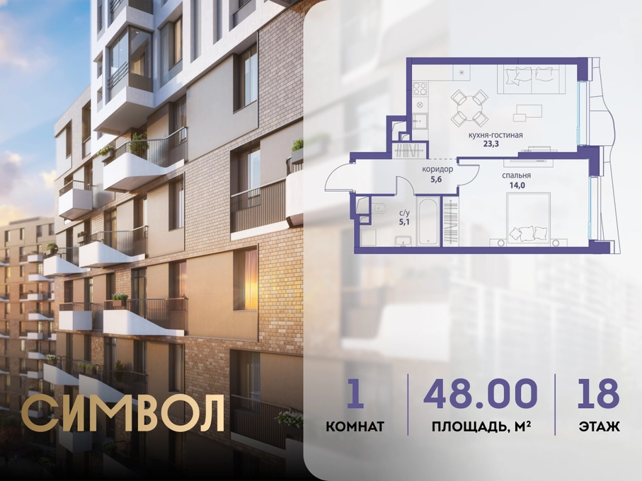 Продается 1-комнатная квартира от застройщика: общая площадь 48.00 м², жилая 14.00 м², кухня 23.30 м², 18-й этаж, жилой квартал «Вдохновение», корпус 35 (секция 1). Срок сдачи: 4 квартал 2027 года. <br> <br>Действует большой выбор скидок и ипотечных программ: вы можете выбрать те, что подходят именно вам. <br> <br>Акции и рассрочка: <br>• Видовые квартиры. Старт продаж! <br>• Беспроцентная рассрочка! <br> <br>Позвоните сейчас и забронируйте квартиру! <br> <br>Квартал бизнес-класса СИМВОЛ — это городское пространство нового поколения в историческом районе Лефортово, на границе ЦАО, в 2 км от Садового кольца. <br>Бионическая архитектура СИМВОЛА превратила Лефортово в суперсовременное и модное пространство. Из окон, с балконов и террас просторных квартир СИМВОЛА открываются отличные виды на город и новый парк «Зеленая река», «протекающий» через все кварталы комплекса на 2 км. <br>В квартале уже есть все, что нужно для комфортной жизни: кафе и рестораны, супермаркеты и магазины, медицинские и физкультурно-оздоровительные центры, салоны красоты и барбершопы, аптеки и оптики, химчистки, пункты доставки и другие сервисы — всего более 90 действующих объектов внутриквартальной инфраструктуры. <br>Для юных жителей СИМВОЛА открыты детский сад и инженерный лицей при МГТУ им. Баумана. <br> <br>Особенности квартала: <br>• Свой парк «Зеленая Река» - 10 га зелени и развлечений на любой вкус! <br>• Уникальная для Москвы архитектура - Проект создан архитектурной мастерской ATRIUM по дизайн-коду британских бюро LDA Design и UHA London. <br>• Богатая инфраструктура с детскими садами и лицеем им. Баумана, кафе и ресторанами, супермаркетами и аптеками, зоной для фитнеса, бассейном и мед. центром. <br>• Квартиры с панорамными окнами, террасами, ванными с окнами и каминами редких форматов. <br>• Закрытые безопасные зелёные дворы-парки без машин!О застройщике