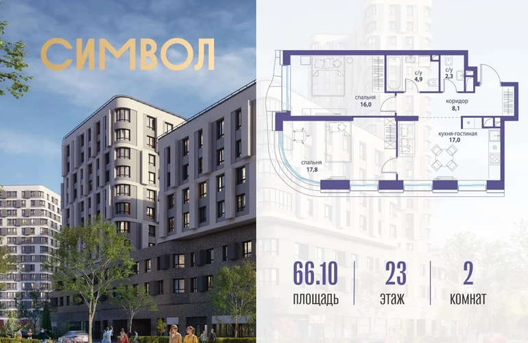 Продается 2-комнатная квартира от застройщика: общая площадь 66.10 м², жилая 33.80 м², кухня 17.00 м², 23-й этаж, жилой квартал «Вдохновение», корпус 35 (секция 1). Срок сдачи: 4 квартал 2027 года. Позвоните сейчас и забронируйте квартиру! Квартал бизнес-класса СИМВОЛ — это городское пространство нового поколения в историческом районе Лефортово, на границе ЦАО, в 2 км от Садового кольца. Бионическая архитектура СИМВОЛА превратила Лефортово в суперсовременное и модное пространство. Из окон, с балконов и террас просторных квартир СИМВОЛА открываются отличные виды на город и новый парк «Зеленая река», «протекающий» через все кварталы комплекса на 2 км. В квартале уже есть все, что нужно для комфортной жизни: кафе и рестораны, супермаркеты и магазины, медицинские и физкультурно-оздоровительные центры, салоны красоты и барбершопы, аптеки и оптики, химчистки, пункты доставки и другие сервисы — всего более 90 действующих объектов внутриквартальной инфраструктуры. Для юных жителей СИМВОЛА открыты детский сад и инженерный лицей при МГТУ им. Баумана. Особенности квартала: • Свой парк «Зеленая Река» - 10 га зелени и развлечений на любой вкус! • Уникальная для Москвы архитектура - Проект создан архитектурной мастерской ATRIUM по дизайн-коду британских бюро LDA Design и UHA London. • Богатая инфраструктура с детскими садами и лицеем им. Баумана, кафе и ресторанами, супермаркетами и аптеками, зоной для фитнеса, бассейном и мед. центром. • Квартиры с панорамными окнами, террасами, ванными с окнами и каминами редких форматов. • Закрытые безопасные зелёные дворы-парки без машин!О застройщике