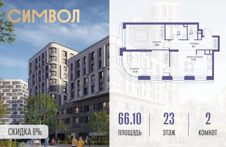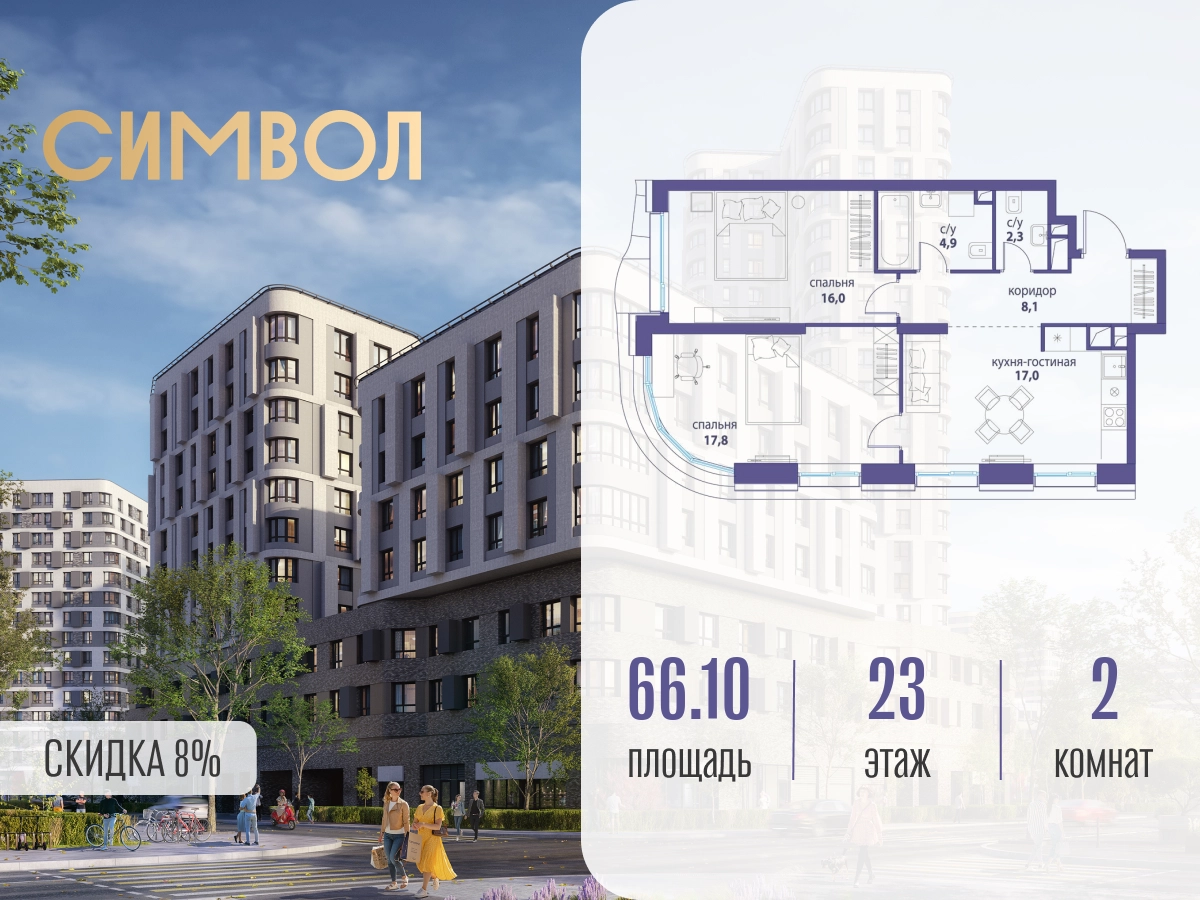 Продается 2-комнатная квартира от застройщика: общая площадь 66.10 м², жилая 33.80 м², кухня 17.00 м², 23-й этаж, жилой квартал «Вдохновение», корпус 35 (секция 1). Срок сдачи: 4 квартал 2027 года. Позвоните сейчас и забронируйте квартиру! Квартал бизнес-класса СИМВОЛ — это городское пространство нового поколения в историческом районе Лефортово, на границе ЦАО, в 2 км от Садового кольца. Бионическая архитектура СИМВОЛА превратила Лефортово в суперсовременное и модное пространство. Из окон, с балконов и террас просторных квартир СИМВОЛА открываются отличные виды на город и новый парк «Зеленая река», «протекающий» через все кварталы комплекса на 2 км. В квартале уже есть все, что нужно для комфортной жизни: кафе и рестораны, супермаркеты и магазины, медицинские и физкультурно-оздоровительные центры, салоны красоты и барбершопы, аптеки и оптики, химчистки, пункты доставки и другие сервисы — всего более 90 действующих объектов внутриквартальной инфраструктуры. Для юных жителей СИМВОЛА открыты детский сад и инженерный лицей при МГТУ им. Баумана. Особенности квартала: • Свой парк «Зеленая Река» - 10 га зелени и развлечений на любой вкус! • Уникальная для Москвы архитектура - Проект создан архитектурной мастерской ATRIUM по дизайн-коду британских бюро LDA Design и UHA London. • Богатая инфраструктура с детскими садами и лицеем им. Баумана, кафе и ресторанами, супермаркетами и аптеками, зоной для фитнеса, бассейном и мед. центром. • Квартиры с панорамными окнами, террасами, ванными с окнами и каминами редких форматов. • Закрытые безопасные зелёные дворы-парки без машин!О застройщике