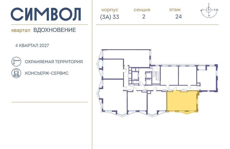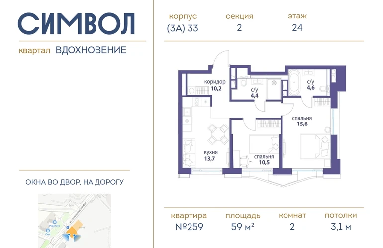 Продается 2-комнатная квартира от застройщика: общая площадь 59.00 м², жилая 26.10 м², кухня 13.70 м², 24-й этаж, жилой квартал «Вдохновение», корпус 33 (секция 2). Срок сдачи: 4 квартал 2027 года. <br> <br>Действует большой выбор скидок и ипотечных программ: вы можете выбрать те, что подходят именно вам. <br> <br>Акции и рассрочка: <br>• Видовые квартиры. Старт продаж! <br>• Беспроцентная рассрочка! <br> <br>Позвоните сейчас и забронируйте квартиру! <br> <br>Квартал бизнес-класса СИМВОЛ — это городское пространство нового поколения в историческом районе Лефортово, на границе ЦАО, в 2 км от Садового кольца. <br>Бионическая архитектура СИМВОЛА превратила Лефортово в суперсовременное и модное пространство. Из окон, с балконов и террас просторных квартир СИМВОЛА открываются отличные виды на город и новый парк «Зеленая река», «протекающий» через все кварталы комплекса на 2 км. <br>В квартале уже есть все, что нужно для комфортной жизни: кафе и рестораны, супермаркеты и магазины, медицинские и физкультурно-оздоровительные центры, салоны красоты и барбершопы, аптеки и оптики, химчистки, пункты доставки и другие сервисы — всего более 90 действующих объектов внутриквартальной инфраструктуры. <br>Для юных жителей СИМВОЛА открыты детский сад и инженерный лицей при МГТУ им. Баумана. <br> <br>Особенности квартала: <br>• Свой парк «Зеленая Река» - 10 га зелени и развлечений на любой вкус! <br>• Уникальная для Москвы архитектура - Проект создан архитектурной мастерской ATRIUM по дизайн-коду британских бюро LDA Design и UHA London. <br>• Богатая инфраструктура с детскими садами и лицеем им. Баумана, кафе и ресторанами, супермаркетами и аптеками, зоной для фитнеса, бассейном и мед. центром. <br>• Квартиры с панорамными окнами, террасами, ванными с окнами и каминами редких форматов. <br>• Закрытые безопасные зелёные дворы-парки без машин!О застройщике