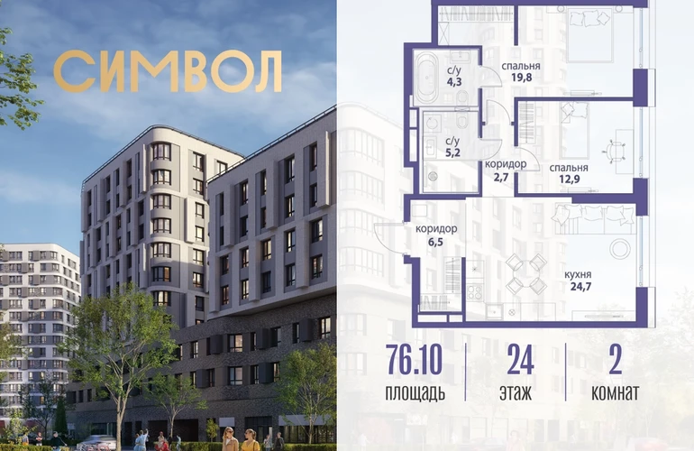 Продается 2-комнатная квартира от застройщика: общая площадь 76.10 м², жилая 32.70 м², кухня 24.70 м², 24-й этаж, жилой квартал «Вдохновение», корпус 33 (секция 3). Срок сдачи: 4 квартал 2027 года. Позвоните сейчас и забронируйте квартиру! Квартал бизнес-класса СИМВОЛ — это городское пространство нового поколения в историческом районе Лефортово, на границе ЦАО, в 2 км от Садового кольца. Бионическая архитектура СИМВОЛА превратила Лефортово в суперсовременное и модное пространство. Из окон, с балконов и террас просторных квартир СИМВОЛА открываются отличные виды на город и новый парк «Зеленая река», «протекающий» через все кварталы комплекса на 2 км. В квартале уже есть все, что нужно для комфортной жизни: кафе и рестораны, супермаркеты и магазины, медицинские и физкультурно-оздоровительные центры, салоны красоты и барбершопы, аптеки и оптики, химчистки, пункты доставки и другие сервисы — всего более 90 действующих объектов внутриквартальной инфраструктуры. Для юных жителей СИМВОЛА открыты детский сад и инженерный лицей при МГТУ им. Баумана. Особенности квартала: • Свой парк «Зеленая Река» - 10 га зелени и развлечений на любой вкус! • Уникальная для Москвы архитектура - Проект создан архитектурной мастерской ATRIUM по дизайн-коду британских бюро LDA Design и UHA London. • Богатая инфраструктура с детскими садами и лицеем им. Баумана, кафе и ресторанами, супермаркетами и аптеками, зоной для фитнеса, бассейном и мед. центром. • Квартиры с панорамными окнами, террасами, ванными с окнами и каминами редких форматов. • Закрытые безопасные зелёные дворы-парки без машин!О застройщике