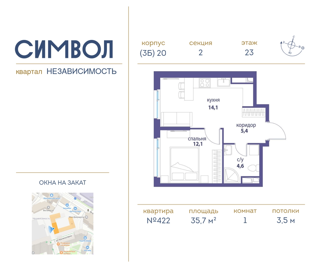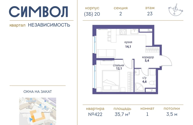 Продается 1-комнатная квартира от застройщика: общая площадь 35.70 м², жилая 12.10 м², кухня 14.10 м², 23-й этаж, жилой квартал «Независимость», корпус 20 (секция 2). Срок сдачи: 3 квартал 2025 года. <br> <br>Действует большой выбор скидок и ипотечных программ: вы можете выбрать те, что подходят именно вам. <br> <br>Акции и рассрочка: <br>• Видовые квартиры. Старт продаж! <br>• Беспроцентная рассрочка! <br> <br>Позвоните сейчас и забронируйте квартиру! <br> <br>Квартал бизнес-класса СИМВОЛ — это городское пространство нового поколения в историческом районе Лефортово, на границе ЦАО, в 2 км от Садового кольца. <br>Бионическая архитектура СИМВОЛА превратила Лефортово в суперсовременное и модное пространство. Из окон, с балконов и террас просторных квартир СИМВОЛА открываются отличные виды на город и новый парк «Зеленая река», «протекающий» через все кварталы комплекса на 2 км. <br>В квартале уже есть все, что нужно для комфортной жизни: кафе и рестораны, супермаркеты и магазины, медицинские и физкультурно-оздоровительные центры, салоны красоты и барбершопы, аптеки и оптики, химчистки, пункты доставки и другие сервисы — всего более 90 действующих объектов внутриквартальной инфраструктуры. <br>Для юных жителей СИМВОЛА открыты детский сад и инженерный лицей при МГТУ им. Баумана. <br> <br>Особенности квартала: <br>• Свой парк «Зеленая Река» - 10 га зелени и развлечений на любой вкус! <br>• Уникальная для Москвы архитектура - Проект создан архитектурной мастерской ATRIUM по дизайн-коду британских бюро LDA Design и UHA London. <br>• Богатая инфраструктура с детскими садами и лицеем им. Баумана, кафе и ресторанами, супермаркетами и аптеками, зоной для фитнеса, бассейном и мед. центром. <br>• Квартиры с панорамными окнами, террасами, ванными с окнами и каминами редких форматов. <br>• Закрытые безопасные зелёные дворы-парки без машин!О застройщике