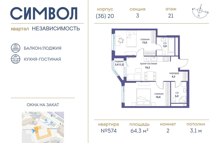 Продается 2-комнатная квартира от застройщика: общая площадь 64.30 м², жилая 32.20 м², кухня 16.20 м², 21-й этаж, жилой квартал «Независимость», корпус 20 (секция 3). Срок сдачи: 3 квартал 2025 года. <br> <br>Действует большой выбор скидок и ипотечных программ: вы можете выбрать те, что подходят именно вам. <br> <br>Акции и рассрочка: <br>• Видовые квартиры. Старт продаж! <br>• Беспроцентная рассрочка! <br> <br>Позвоните сейчас и забронируйте квартиру! <br> <br>Квартал бизнес-класса СИМВОЛ — это городское пространство нового поколения в историческом районе Лефортово, на границе ЦАО, в 2 км от Садового кольца. <br>Бионическая архитектура СИМВОЛА превратила Лефортово в суперсовременное и модное пространство. Из окон, с балконов и террас просторных квартир СИМВОЛА открываются отличные виды на город и новый парк «Зеленая река», «протекающий» через все кварталы комплекса на 2 км. <br>В квартале уже есть все, что нужно для комфортной жизни: кафе и рестораны, супермаркеты и магазины, медицинские и физкультурно-оздоровительные центры, салоны красоты и барбершопы, аптеки и оптики, химчистки, пункты доставки и другие сервисы — всего более 90 действующих объектов внутриквартальной инфраструктуры. <br>Для юных жителей СИМВОЛА открыты детский сад и инженерный лицей при МГТУ им. Баумана. <br> <br>Особенности квартала: <br>• Свой парк «Зеленая Река» - 10 га зелени и развлечений на любой вкус! <br>• Уникальная для Москвы архитектура - Проект создан архитектурной мастерской ATRIUM по дизайн-коду британских бюро LDA Design и UHA London. <br>• Богатая инфраструктура с детскими садами и лицеем им. Баумана, кафе и ресторанами, супермаркетами и аптеками, зоной для фитнеса, бассейном и мед. центром. <br>• Квартиры с панорамными окнами, террасами, ванными с окнами и каминами редких форматов. <br>• Закрытые безопасные зелёные дворы-парки без машин!О застройщике