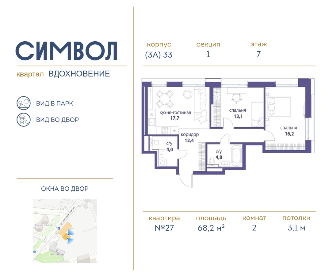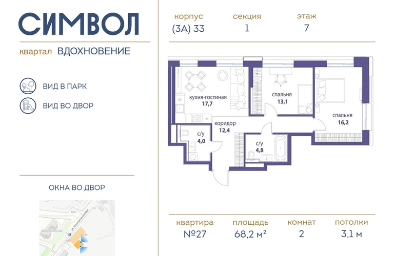 Продается 2-комнатная квартира от застройщика: общая площадь 68.20 м², жилая 29.70 м², кухня 19.50 м², 7-й этаж, жилой квартал «Вдохновение», корпус 33 (секция 3). Срок сдачи: 4 квартал 2027 года. <br> <br>Действует большой выбор скидок и ипотечных программ: вы можете выбрать те, что подходят именно вам. <br> <br>Акции и рассрочка: <br>• Видовые квартиры. Старт продаж! <br>• Беспроцентная рассрочка! <br> <br>Позвоните сейчас и забронируйте квартиру! <br> <br>Квартал бизнес-класса СИМВОЛ — это городское пространство нового поколения в историческом районе Лефортово, на границе ЦАО, в 2 км от Садового кольца. <br>Бионическая архитектура СИМВОЛА превратила Лефортово в суперсовременное и модное пространство. Из окон, с балконов и террас просторных квартир СИМВОЛА открываются отличные виды на город и новый парк «Зеленая река», «протекающий» через все кварталы комплекса на 2 км. <br>В квартале уже есть все, что нужно для комфортной жизни: кафе и рестораны, супермаркеты и магазины, медицинские и физкультурно-оздоровительные центры, салоны красоты и барбершопы, аптеки и оптики, химчистки, пункты доставки и другие сервисы — всего более 90 действующих объектов внутриквартальной инфраструктуры. <br>Для юных жителей СИМВОЛА открыты детский сад и инженерный лицей при МГТУ им. Баумана. <br> <br>Особенности квартала: <br>• Свой парк «Зеленая Река» - 10 га зелени и развлечений на любой вкус! <br>• Уникальная для Москвы архитектура - Проект создан архитектурной мастерской ATRIUM по дизайн-коду британских бюро LDA Design и UHA London. <br>• Богатая инфраструктура с детскими садами и лицеем им. Баумана, кафе и ресторанами, супермаркетами и аптеками, зоной для фитнеса, бассейном и мед. центром. <br>• Квартиры с панорамными окнами, террасами, ванными с окнами и каминами редких форматов. <br>• Закрытые безопасные зелёные дворы-парки без машин!