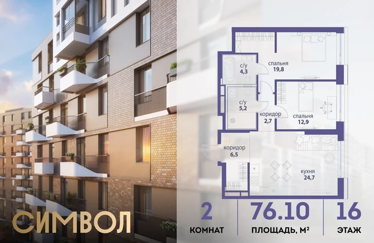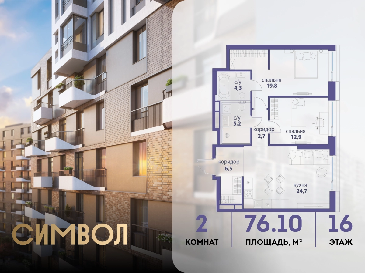 Продается 2-комнатная квартира от застройщика: общая площадь 76.10 м², жилая 32.70 м², кухня 24.70 м², 16-й этаж, жилой квартал «Вдохновение», корпус 33 (секция 3). Срок сдачи: 4 квартал 2027 года. Позвоните сейчас и забронируйте квартиру! Квартал бизнес-класса СИМВОЛ — это городское пространство нового поколения в историческом районе Лефортово, на границе ЦАО, в 2 км от Садового кольца. Бионическая архитектура СИМВОЛА превратила Лефортово в суперсовременное и модное пространство. Из окон, с балконов и террас просторных квартир СИМВОЛА открываются отличные виды на город и новый парк «Зеленая река», «протекающий» через все кварталы комплекса на 2 км. В квартале уже есть все, что нужно для комфортной жизни: кафе и рестораны, супермаркеты и магазины, медицинские и физкультурно-оздоровительные центры, салоны красоты и барбершопы, аптеки и оптики, химчистки, пункты доставки и другие сервисы — всего более 90 действующих объектов внутриквартальной инфраструктуры. Для юных жителей СИМВОЛА открыты детский сад и инженерный лицей при МГТУ им. Баумана. Особенности квартала: • Свой парк «Зеленая Река» - 10 га зелени и развлечений на любой вкус! • Уникальная для Москвы архитектура - Проект создан архитектурной мастерской ATRIUM по дизайн-коду британских бюро LDA Design и UHA London. • Богатая инфраструктура с детскими садами и лицеем им. Баумана, кафе и ресторанами, супермаркетами и аптеками, зоной для фитнеса, бассейном и мед. центром. • Квартиры с панорамными окнами, террасами, ванными с окнами и каминами редких форматов. • Закрытые безопасные зелёные дворы-парки без машин!О застройщике