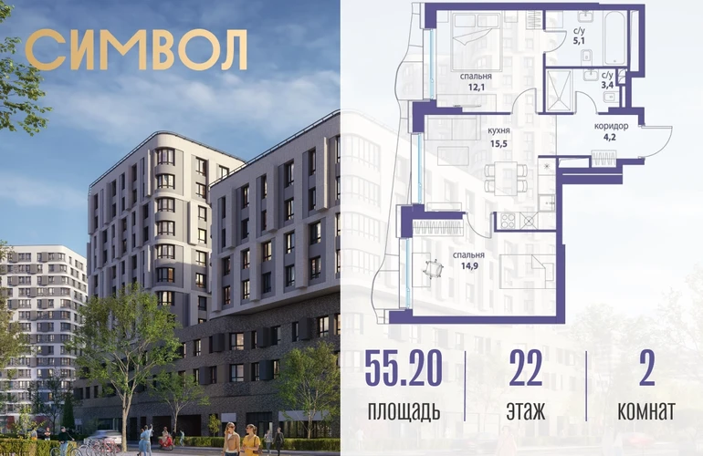 Продается 2-комнатная квартира от застройщика: общая площадь 55.20 м², жилая 27.00 м², кухня 15.50 м², 22-й этаж, жилой квартал «Вдохновение», корпус 34 (секция 1). Срок сдачи: 4 квартал 2027 года. Позвоните сейчас и забронируйте квартиру! Квартал бизнес-класса СИМВОЛ — это городское пространство нового поколения в историческом районе Лефортово, на границе ЦАО, в 2 км от Садового кольца. Бионическая архитектура СИМВОЛА превратила Лефортово в суперсовременное и модное пространство. Из окон, с балконов и террас просторных квартир СИМВОЛА открываются отличные виды на город и новый парк «Зеленая река», «протекающий» через все кварталы комплекса на 2 км. В квартале уже есть все, что нужно для комфортной жизни: кафе и рестораны, супермаркеты и магазины, медицинские и физкультурно-оздоровительные центры, салоны красоты и барбершопы, аптеки и оптики, химчистки, пункты доставки и другие сервисы — всего более 90 действующих объектов внутриквартальной инфраструктуры. Для юных жителей СИМВОЛА открыты детский сад и инженерный лицей при МГТУ им. Баумана. Особенности квартала: • Свой парк «Зеленая Река» - 10 га зелени и развлечений на любой вкус! • Уникальная для Москвы архитектура - Проект создан архитектурной мастерской ATRIUM по дизайн-коду британских бюро LDA Design и UHA London. • Богатая инфраструктура с детскими садами и лицеем им. Баумана, кафе и ресторанами, супермаркетами и аптеками, зоной для фитнеса, бассейном и мед. центром. • Квартиры с панорамными окнами, террасами, ванными с окнами и каминами редких форматов. • Закрытые безопасные зелёные дворы-парки без машин!О застройщике