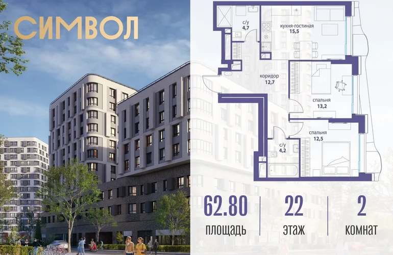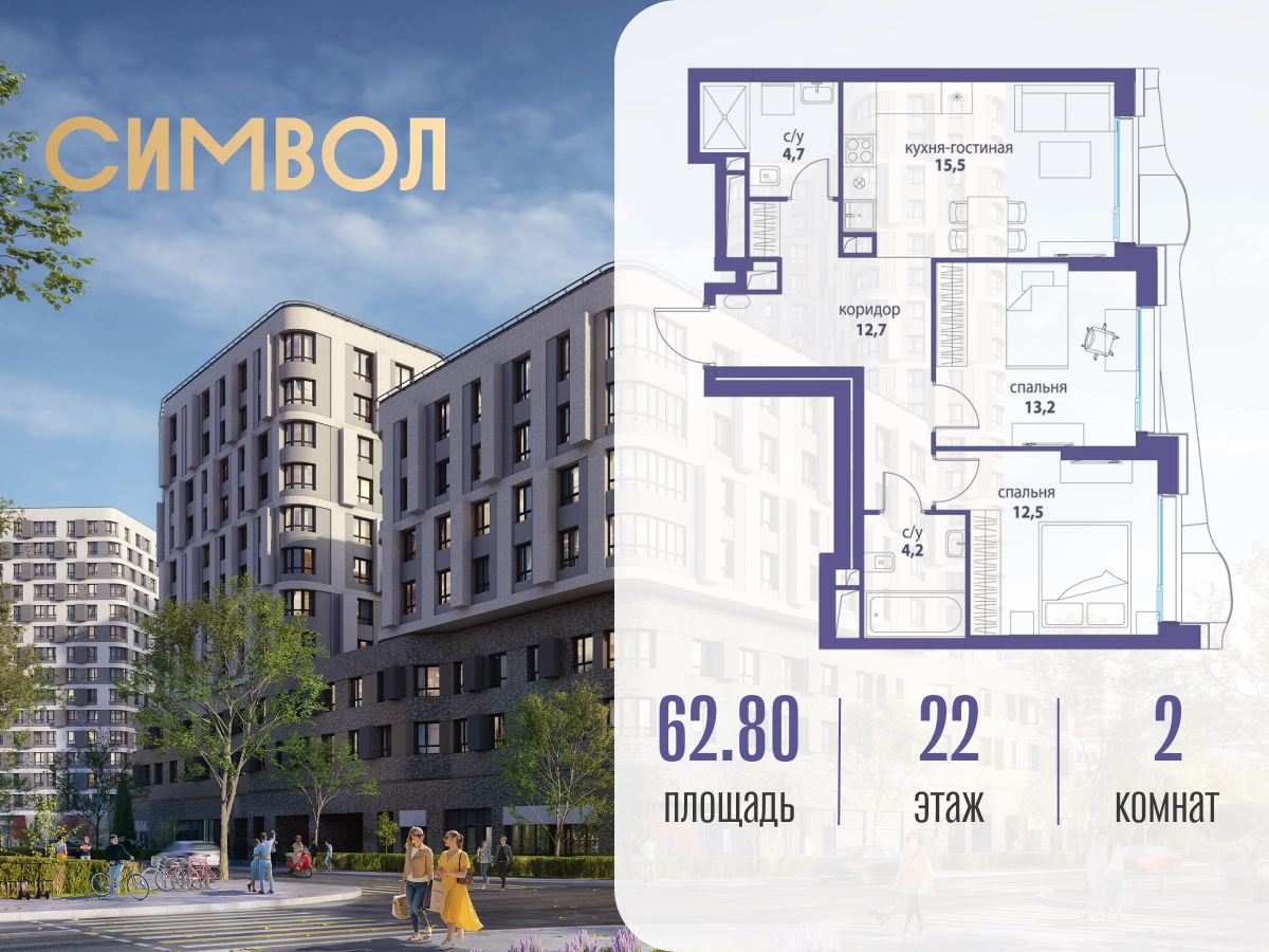 Продается 2-комнатная квартира от застройщика: общая площадь 62.80 м², жилая 25.70 м², кухня 15.50 м², 22-й этаж, жилой квартал «Вдохновение», корпус 34 (секция 1). Срок сдачи: 4 квартал 2027 года. Позвоните сейчас и забронируйте квартиру! Квартал бизнес-класса СИМВОЛ — это городское пространство нового поколения в историческом районе Лефортово, на границе ЦАО, в 2 км от Садового кольца. Бионическая архитектура СИМВОЛА превратила Лефортово в суперсовременное и модное пространство. Из окон, с балконов и террас просторных квартир СИМВОЛА открываются отличные виды на город и новый парк «Зеленая река», «протекающий» через все кварталы комплекса на 2 км. В квартале уже есть все, что нужно для комфортной жизни: кафе и рестораны, супермаркеты и магазины, медицинские и физкультурно-оздоровительные центры, салоны красоты и барбершопы, аптеки и оптики, химчистки, пункты доставки и другие сервисы — всего более 90 действующих объектов внутриквартальной инфраструктуры. Для юных жителей СИМВОЛА открыты детский сад и инженерный лицей при МГТУ им. Баумана. Особенности квартала: • Свой парк «Зеленая Река» - 10 га зелени и развлечений на любой вкус! • Уникальная для Москвы архитектура - Проект создан архитектурной мастерской ATRIUM по дизайн-коду британских бюро LDA Design и UHA London. • Богатая инфраструктура с детскими садами и лицеем им. Баумана, кафе и ресторанами, супермаркетами и аптеками, зоной для фитнеса, бассейном и мед. центром. • Квартиры с панорамными окнами, террасами, ванными с окнами и каминами редких форматов. • Закрытые безопасные зелёные дворы-парки без машин!О застройщике
