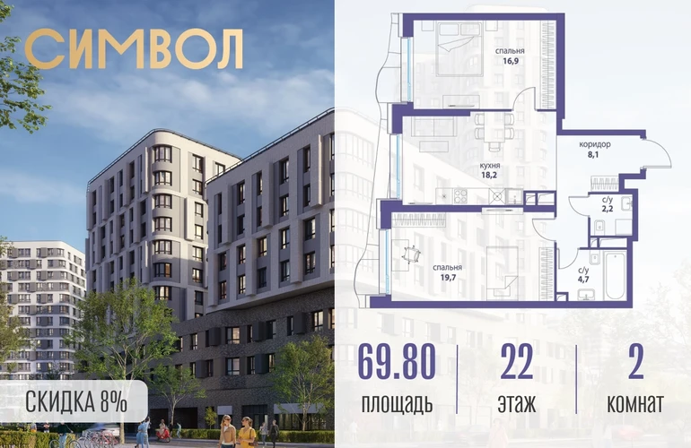 Продается 2-комнатная квартира от застройщика: общая площадь 69.80 м², жилая 36.60 м², кухня 18.20 м², 22-й этаж, жилой квартал «Вдохновение», корпус 34 (секция 1). Срок сдачи: 4 квартал 2027 года. Позвоните сейчас и забронируйте квартиру! Квартал бизнес-класса СИМВОЛ — это городское пространство нового поколения в историческом районе Лефортово, на границе ЦАО, в 2 км от Садового кольца. Бионическая архитектура СИМВОЛА превратила Лефортово в суперсовременное и модное пространство. Из окон, с балконов и террас просторных квартир СИМВОЛА открываются отличные виды на город и новый парк «Зеленая река», «протекающий» через все кварталы комплекса на 2 км. В квартале уже есть все, что нужно для комфортной жизни: кафе и рестораны, супермаркеты и магазины, медицинские и физкультурно-оздоровительные центры, салоны красоты и барбершопы, аптеки и оптики, химчистки, пункты доставки и другие сервисы — всего более 90 действующих объектов внутриквартальной инфраструктуры. Для юных жителей СИМВОЛА открыты детский сад и инженерный лицей при МГТУ им. Баумана. Особенности квартала: • Свой парк «Зеленая Река» - 10 га зелени и развлечений на любой вкус! • Уникальная для Москвы архитектура - Проект создан архитектурной мастерской ATRIUM по дизайн-коду британских бюро LDA Design и UHA London. • Богатая инфраструктура с детскими садами и лицеем им. Баумана, кафе и ресторанами, супермаркетами и аптеками, зоной для фитнеса, бассейном и мед. центром. • Квартиры с панорамными окнами, террасами, ванными с окнами и каминами редких форматов. • Закрытые безопасные зелёные дворы-парки без машин!О застройщике