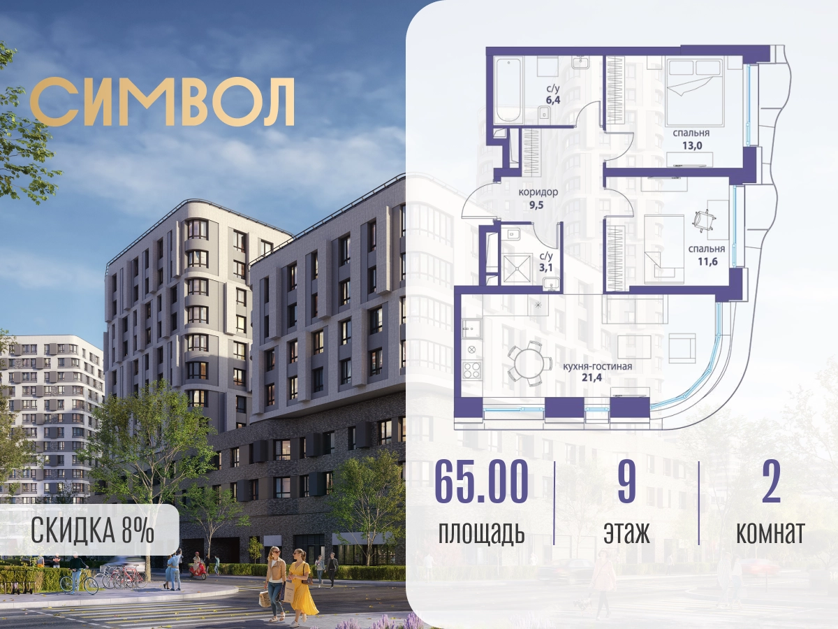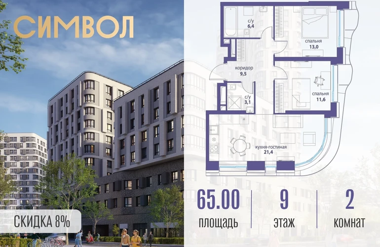 Продается 2-комнатная квартира от застройщика: общая площадь 65.00 м², жилая 24.60 м², кухня 21.40 м², 9-й этаж, жилой квартал «Вдохновение», корпус 34 (секция 1). Срок сдачи: 4 квартал 2027 года. Позвоните сейчас и забронируйте квартиру! Квартал бизнес-класса СИМВОЛ — это городское пространство нового поколения в историческом районе Лефортово, на границе ЦАО, в 2 км от Садового кольца. Бионическая архитектура СИМВОЛА превратила Лефортово в суперсовременное и модное пространство. Из окон, с балконов и террас просторных квартир СИМВОЛА открываются отличные виды на город и новый парк «Зеленая река», «протекающий» через все кварталы комплекса на 2 км. В квартале уже есть все, что нужно для комфортной жизни: кафе и рестораны, супермаркеты и магазины, медицинские и физкультурно-оздоровительные центры, салоны красоты и барбершопы, аптеки и оптики, химчистки, пункты доставки и другие сервисы — всего более 90 действующих объектов внутриквартальной инфраструктуры. Для юных жителей СИМВОЛА открыты детский сад и инженерный лицей при МГТУ им. Баумана. Особенности квартала: • Свой парк «Зеленая Река» - 10 га зелени и развлечений на любой вкус! • Уникальная для Москвы архитектура - Проект создан архитектурной мастерской ATRIUM по дизайн-коду британских бюро LDA Design и UHA London. • Богатая инфраструктура с детскими садами и лицеем им. Баумана, кафе и ресторанами, супермаркетами и аптеками, зоной для фитнеса, бассейном и мед. центром. • Квартиры с панорамными окнами, террасами, ванными с окнами и каминами редких форматов. • Закрытые безопасные зелёные дворы-парки без машин!О застройщике