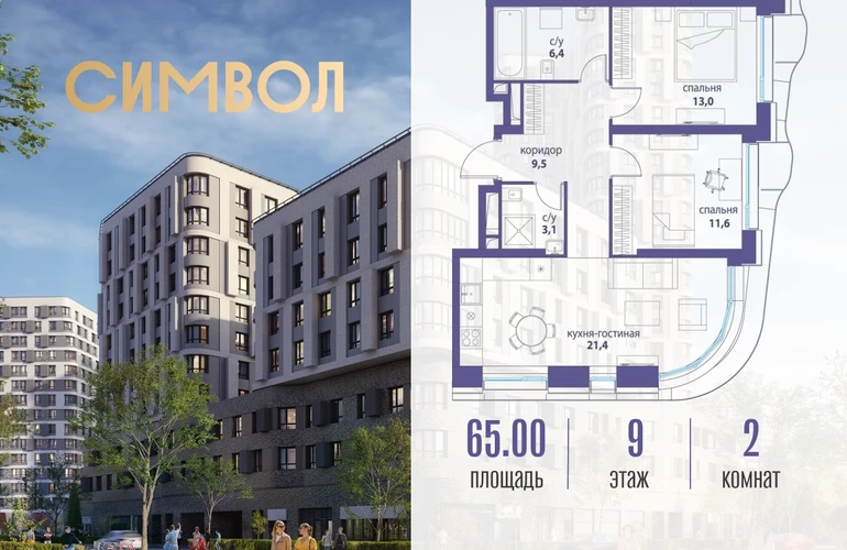 Продается 2-комнатная квартира от застройщика: общая площадь 65.00 м², жилая 24.60 м², кухня 21.40 м², 9-й этаж, жилой квартал «Вдохновение», корпус 34 (секция 1). Срок сдачи: 4 квартал 2027 года. Позвоните сейчас и забронируйте квартиру! Квартал бизнес-класса СИМВОЛ — это городское пространство нового поколения в историческом районе Лефортово, на границе ЦАО, в 2 км от Садового кольца. Бионическая архитектура СИМВОЛА превратила Лефортово в суперсовременное и модное пространство. Из окон, с балконов и террас просторных квартир СИМВОЛА открываются отличные виды на город и новый парк «Зеленая река», «протекающий» через все кварталы комплекса на 2 км. В квартале уже есть все, что нужно для комфортной жизни: кафе и рестораны, супермаркеты и магазины, медицинские и физкультурно-оздоровительные центры, салоны красоты и барбершопы, аптеки и оптики, химчистки, пункты доставки и другие сервисы — всего более 90 действующих объектов внутриквартальной инфраструктуры. Для юных жителей СИМВОЛА открыты детский сад и инженерный лицей при МГТУ им. Баумана. Особенности квартала: • Свой парк «Зеленая Река» - 10 га зелени и развлечений на любой вкус! • Уникальная для Москвы архитектура - Проект создан архитектурной мастерской ATRIUM по дизайн-коду британских бюро LDA Design и UHA London. • Богатая инфраструктура с детскими садами и лицеем им. Баумана, кафе и ресторанами, супермаркетами и аптеками, зоной для фитнеса, бассейном и мед. центром. • Квартиры с панорамными окнами, террасами, ванными с окнами и каминами редких форматов. • Закрытые безопасные зелёные дворы-парки без машин!О застройщике
