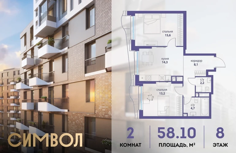 Продается 2-комнатная квартира от застройщика: общая площадь 58.10 м², жилая 28.80 м², кухня 14.30 м², 8-й этаж, жилой квартал «Вдохновение», корпус 34 (секция 1). Срок сдачи: 4 квартал 2027 года. <br> <br>Действует большой выбор скидок и ипотечных программ: вы можете выбрать те, что подходят именно вам. <br> <br>Акции и рассрочка: <br>• Видовые квартиры. Старт продаж! <br>• Беспроцентная рассрочка! <br> <br>Позвоните сейчас и забронируйте квартиру! <br> <br>Квартал бизнес-класса СИМВОЛ — это городское пространство нового поколения в историческом районе Лефортово, на границе ЦАО, в 2 км от Садового кольца. <br>Бионическая архитектура СИМВОЛА превратила Лефортово в суперсовременное и модное пространство. Из окон, с балконов и террас просторных квартир СИМВОЛА открываются отличные виды на город и новый парк «Зеленая река», «протекающий» через все кварталы комплекса на 2 км. <br>В квартале уже есть все, что нужно для комфортной жизни: кафе и рестораны, супермаркеты и магазины, медицинские и физкультурно-оздоровительные центры, салоны красоты и барбершопы, аптеки и оптики, химчистки, пункты доставки и другие сервисы — всего более 90 действующих объектов внутриквартальной инфраструктуры. <br>Для юных жителей СИМВОЛА открыты детский сад и инженерный лицей при МГТУ им. Баумана. <br> <br>Особенности квартала: <br>• Свой парк «Зеленая Река» - 10 га зелени и развлечений на любой вкус! <br>• Уникальная для Москвы архитектура - Проект создан архитектурной мастерской ATRIUM по дизайн-коду британских бюро LDA Design и UHA London. <br>• Богатая инфраструктура с детскими садами и лицеем им. Баумана, кафе и ресторанами, супермаркетами и аптеками, зоной для фитнеса, бассейном и мед. центром. <br>• Квартиры с панорамными окнами, террасами, ванными с окнами и каминами редких форматов. <br>• Закрытые безопасные зелёные дворы-парки без машин!О застройщике