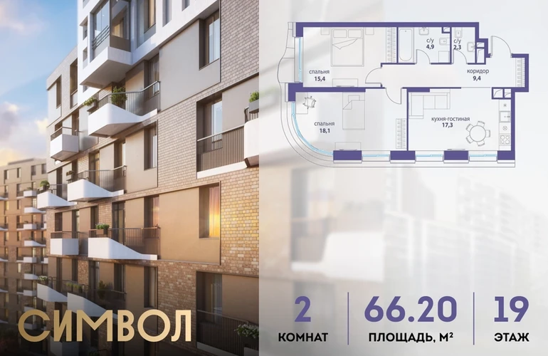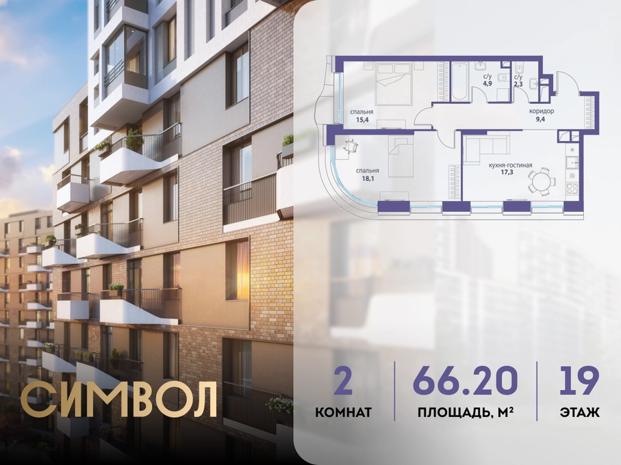 Продается 2-комнатная квартира от застройщика: общая площадь 66.20 м², жилая 33.50 м², кухня 17.30 м², 19-й этаж, жилой квартал «Вдохновение», корпус 34 (секция 1). Срок сдачи: 4 квартал 2027 года. <br> <br>Действует большой выбор скидок и ипотечных программ: вы можете выбрать те, что подходят именно вам. <br> <br>Акции и рассрочка: <br>• Видовые квартиры. Старт продаж! <br>• Беспроцентная рассрочка! <br> <br>Позвоните сейчас и забронируйте квартиру! <br> <br>Квартал бизнес-класса СИМВОЛ — это городское пространство нового поколения в историческом районе Лефортово, на границе ЦАО, в 2 км от Садового кольца. <br>Бионическая архитектура СИМВОЛА превратила Лефортово в суперсовременное и модное пространство. Из окон, с балконов и террас просторных квартир СИМВОЛА открываются отличные виды на город и новый парк «Зеленая река», «протекающий» через все кварталы комплекса на 2 км. <br>В квартале уже есть все, что нужно для комфортной жизни: кафе и рестораны, супермаркеты и магазины, медицинские и физкультурно-оздоровительные центры, салоны красоты и барбершопы, аптеки и оптики, химчистки, пункты доставки и другие сервисы — всего более 90 действующих объектов внутриквартальной инфраструктуры. <br>Для юных жителей СИМВОЛА открыты детский сад и инженерный лицей при МГТУ им. Баумана. <br> <br>Особенности квартала: <br>• Свой парк «Зеленая Река» - 10 га зелени и развлечений на любой вкус! <br>• Уникальная для Москвы архитектура - Проект создан архитектурной мастерской ATRIUM по дизайн-коду британских бюро LDA Design и UHA London. <br>• Богатая инфраструктура с детскими садами и лицеем им. Баумана, кафе и ресторанами, супермаркетами и аптеками, зоной для фитнеса, бассейном и мед. центром. <br>• Квартиры с панорамными окнами, террасами, ванными с окнами и каминами редких форматов. <br>• Закрытые безопасные зелёные дворы-парки без машин!О застройщике