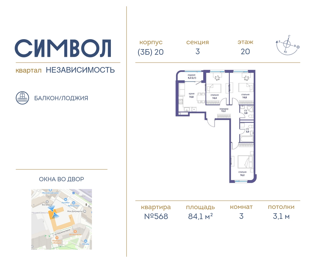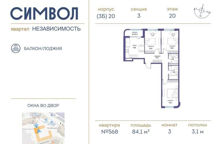 Продается 3-комнатная квартира от застройщика: общая площадь 84.10 м², жилая 45.40 м², кухня 14.80 м², 20-й этаж, жилой квартал «Независимость», корпус 20 (секция 3). Срок сдачи: 3 квартал 2025 года. <br> <br>Действует большой выбор скидок и ипотечных программ: вы можете выбрать те, что подходят именно вам. <br> <br>Акции и рассрочка: <br>• Видовые квартиры. Старт продаж! <br>• Беспроцентная рассрочка! <br> <br>Позвоните сейчас и забронируйте квартиру! <br> <br>Квартал бизнес-класса СИМВОЛ — это городское пространство нового поколения в историческом районе Лефортово, на границе ЦАО, в 2 км от Садового кольца. <br>Бионическая архитектура СИМВОЛА превратила Лефортово в суперсовременное и модное пространство. Из окон, с балконов и террас просторных квартир СИМВОЛА открываются отличные виды на город и новый парк «Зеленая река», «протекающий» через все кварталы комплекса на 2 км. <br>В квартале уже есть все, что нужно для комфортной жизни: кафе и рестораны, супермаркеты и магазины, медицинские и физкультурно-оздоровительные центры, салоны красоты и барбершопы, аптеки и оптики, химчистки, пункты доставки и другие сервисы — всего более 90 действующих объектов внутриквартальной инфраструктуры. <br>Для юных жителей СИМВОЛА открыты детский сад и инженерный лицей при МГТУ им. Баумана. <br> <br>Особенности квартала: <br>• Свой парк «Зеленая Река» - 10 га зелени и развлечений на любой вкус! <br>• Уникальная для Москвы архитектура - Проект создан архитектурной мастерской ATRIUM по дизайн-коду британских бюро LDA Design и UHA London. <br>• Богатая инфраструктура с детскими садами и лицеем им. Баумана, кафе и ресторанами, супермаркетами и аптеками, зоной для фитнеса, бассейном и мед. центром. <br>• Квартиры с панорамными окнами, террасами, ванными с окнами и каминами редких форматов. <br>• Закрытые безопасные зелёные дворы-парки без машин!О застройщике