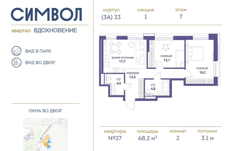 Продается 2-комнатная квартира от застройщика: общая площадь 68.20 м², жилая 29.70 м², кухня 19.50 м², 7-й этаж, жилой квартал «Вдохновение», корпус 33 (секция 3). Срок сдачи: 4 квартал 2027 года. <br> <br>Действует большой выбор скидок и ипотечных программ: вы можете выбрать те, что подходят именно вам. <br> <br>Акции и рассрочка: <br>• Видовые квартиры. Старт продаж! <br>• Беспроцентная рассрочка! <br> <br>Позвоните сейчас и забронируйте квартиру! <br> <br>Квартал бизнес-класса СИМВОЛ — это городское пространство нового поколения в историческом районе Лефортово, на границе ЦАО, в 2 км от Садового кольца. <br>Бионическая архитектура СИМВОЛА превратила Лефортово в суперсовременное и модное пространство. Из окон, с балконов и террас просторных квартир СИМВОЛА открываются отличные виды на город и новый парк «Зеленая река», «протекающий» через все кварталы комплекса на 2 км. <br>В квартале уже есть все, что нужно для комфортной жизни: кафе и рестораны, супермаркеты и магазины, медицинские и физкультурно-оздоровительные центры, салоны красоты и барбершопы, аптеки и оптики, химчистки, пункты доставки и другие сервисы — всего более 90 действующих объектов внутриквартальной инфраструктуры. <br>Для юных жителей СИМВОЛА открыты детский сад и инженерный лицей при МГТУ им. Баумана. <br> <br>Особенности квартала: <br>• Свой парк «Зеленая Река» - 10 га зелени и развлечений на любой вкус! <br>• Уникальная для Москвы архитектура - Проект создан архитектурной мастерской ATRIUM по дизайн-коду британских бюро LDA Design и UHA London. <br>• Богатая инфраструктура с детскими садами и лицеем им. Баумана, кафе и ресторанами, супермаркетами и аптеками, зоной для фитнеса, бассейном и мед. центром. <br>• Квартиры с панорамными окнами, террасами, ванными с окнами и каминами редких форматов. <br>• Закрытые безопасные зелёные дворы-парки без машин!О застройщике
